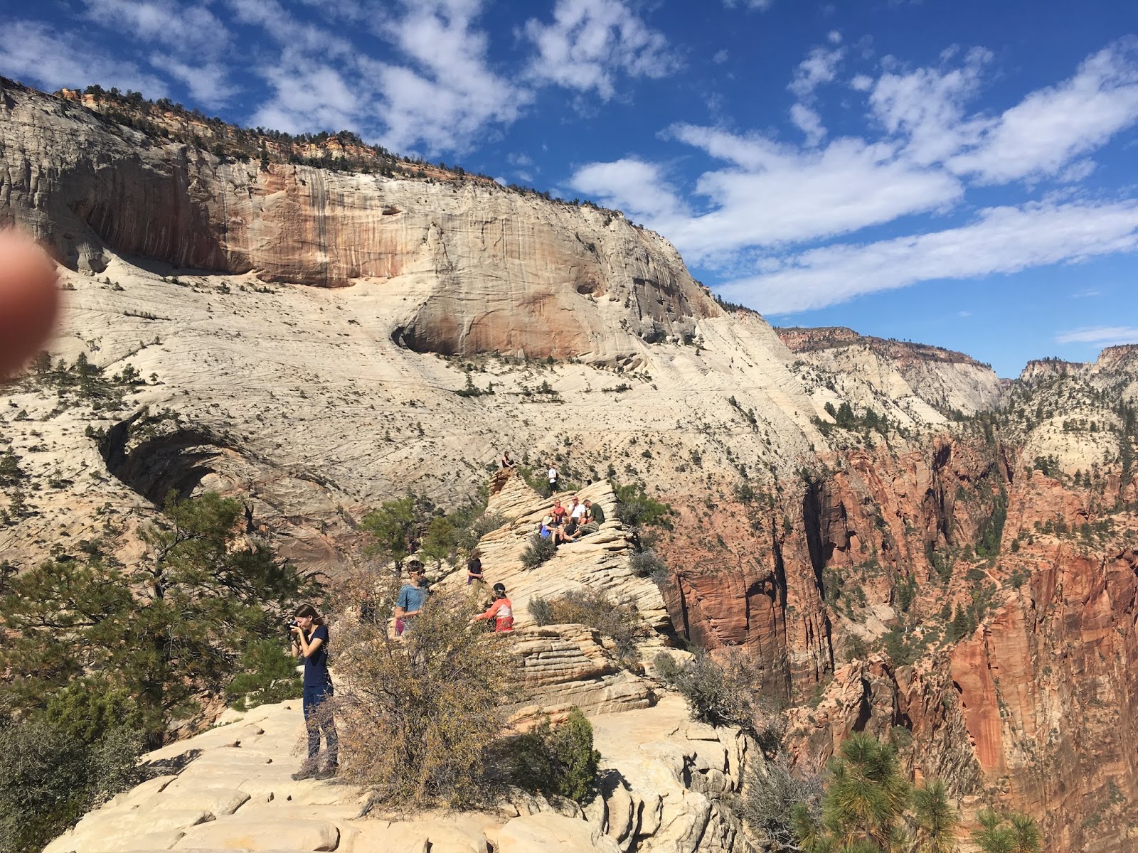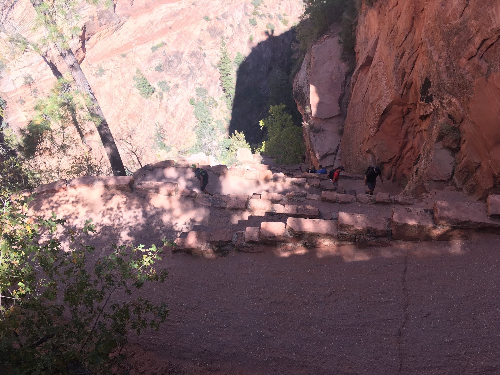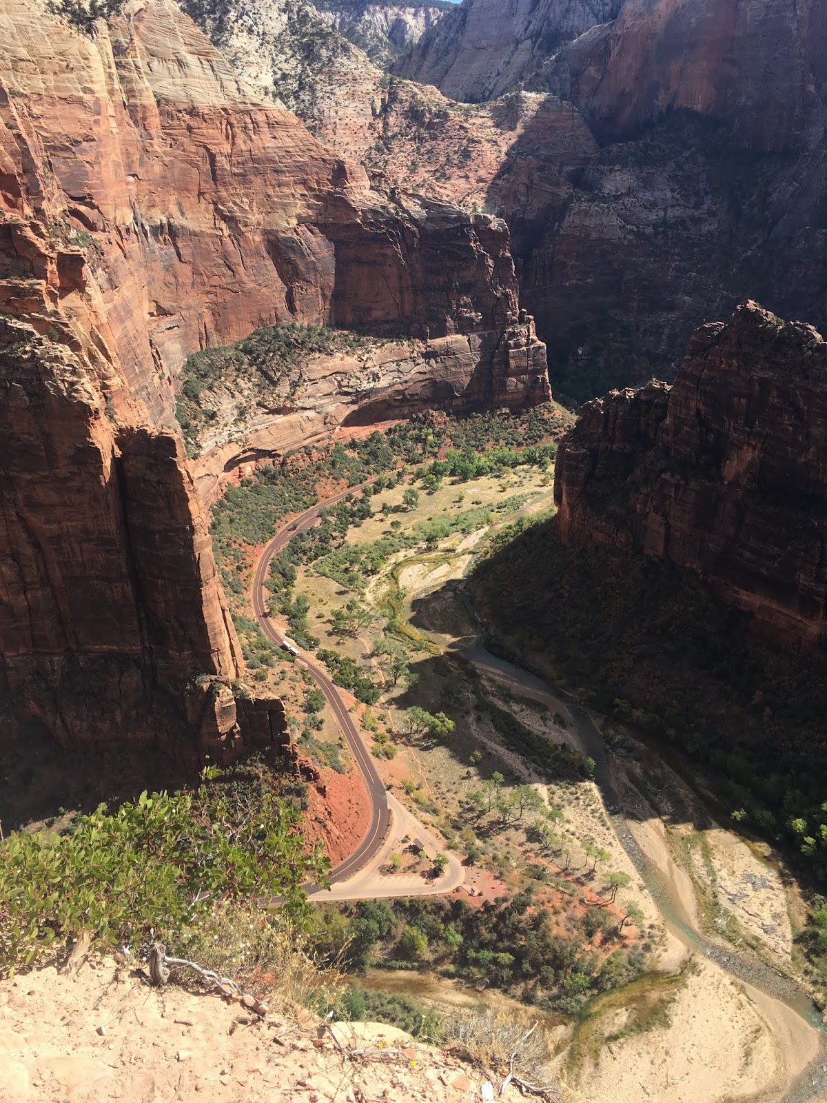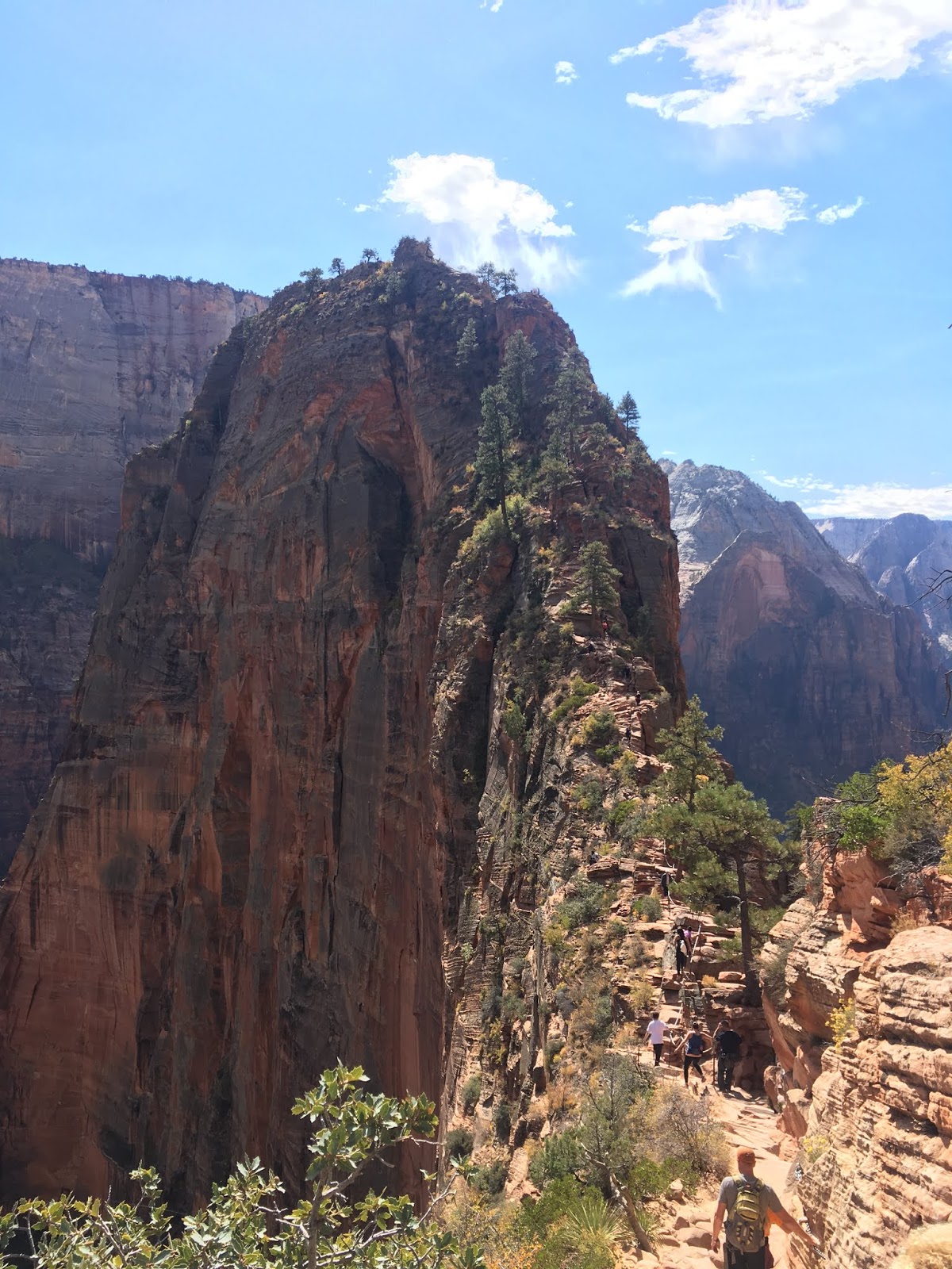 需要手腳並用的景點, 走上稜線之後會有一段路走在瘦稜之上, 有些路段只能一人通過, 不適合有懼高症的人, 搭乘公車至The Grotto站, 會走一小段The West Rim Trail, 至岔路口向右走即是通往Angel's Landing的終點, 而Angels Landing公車站則是在河邊欣賞山勢