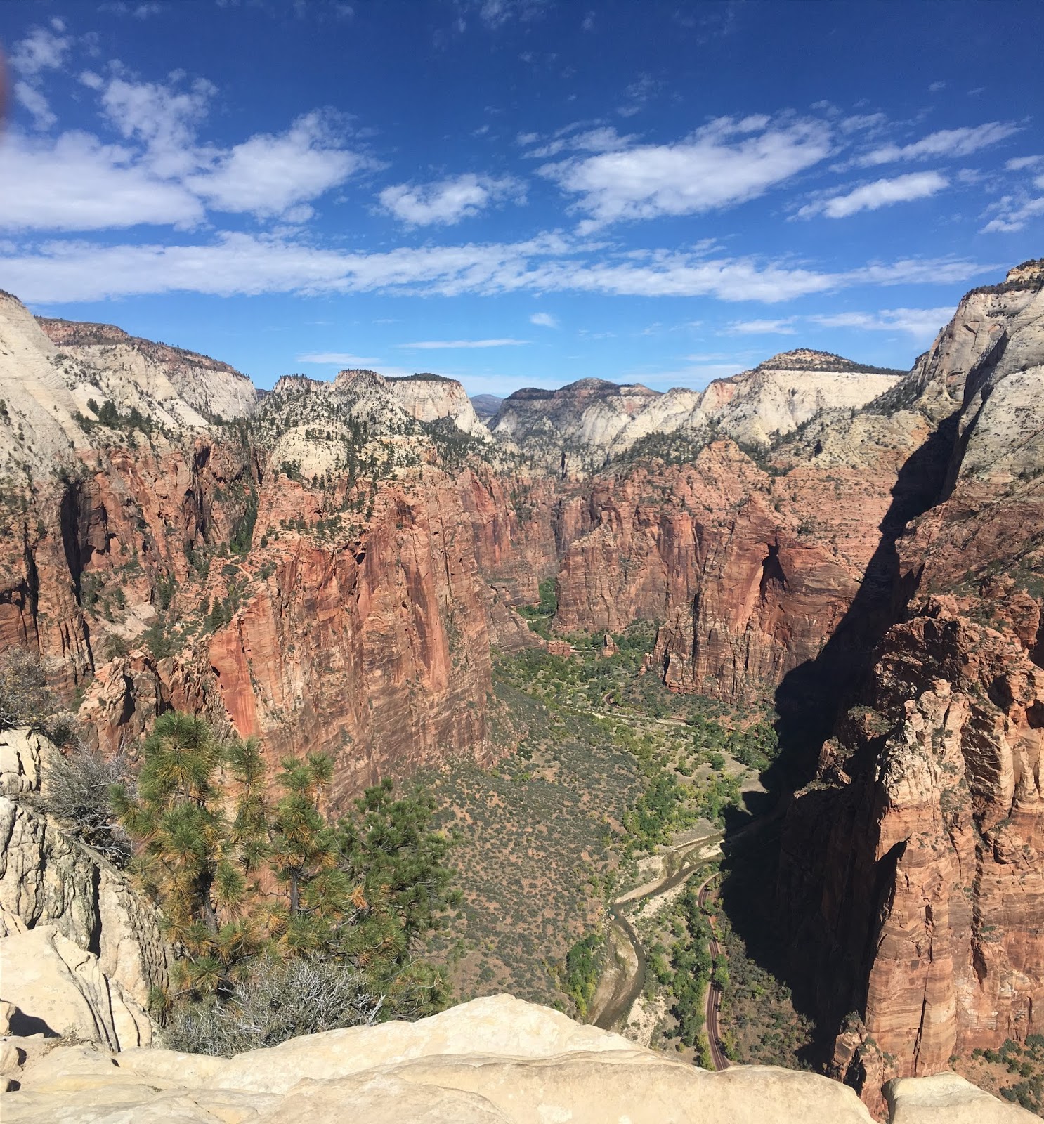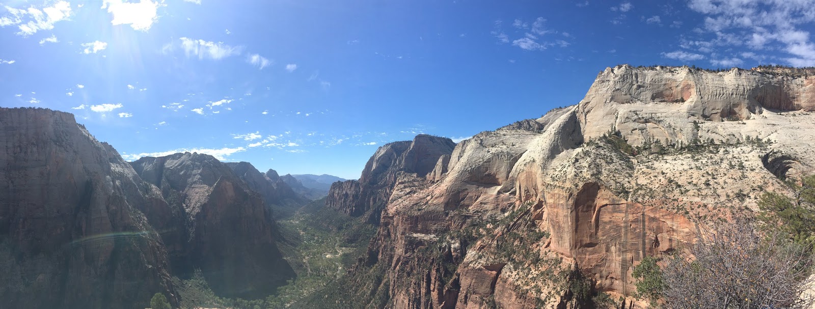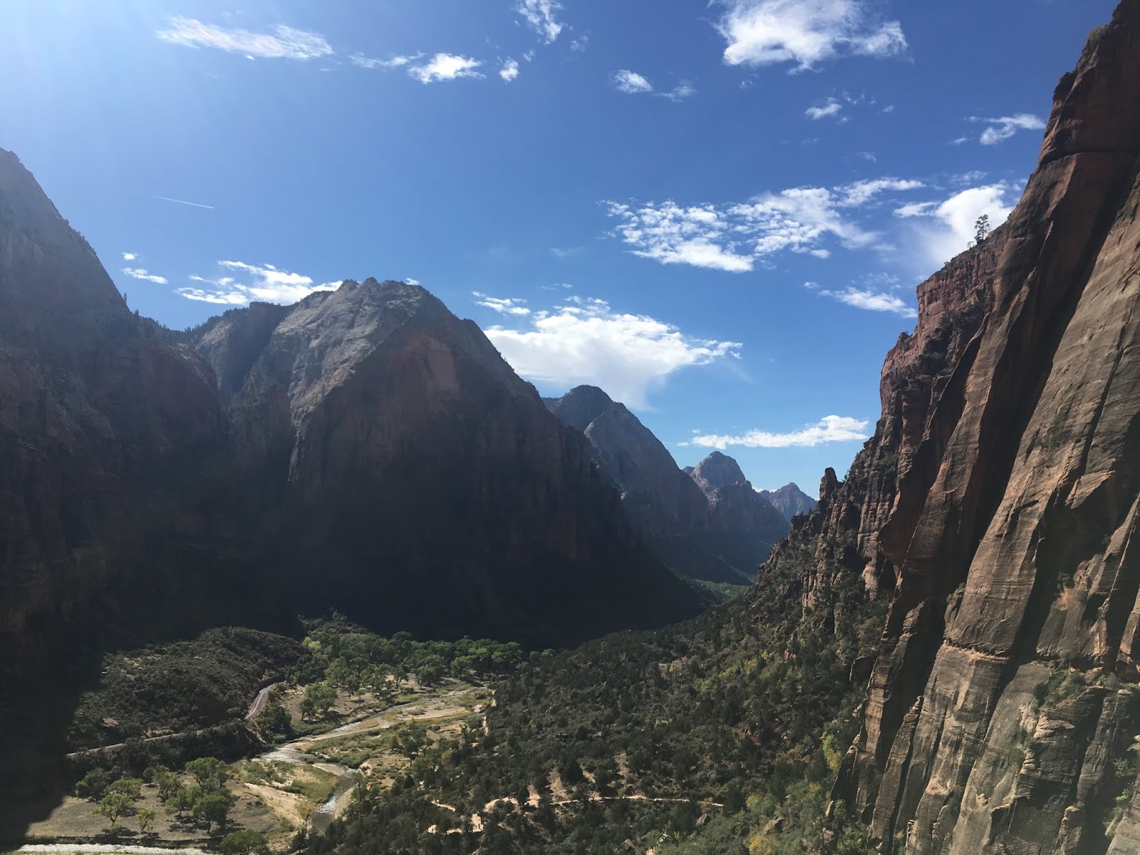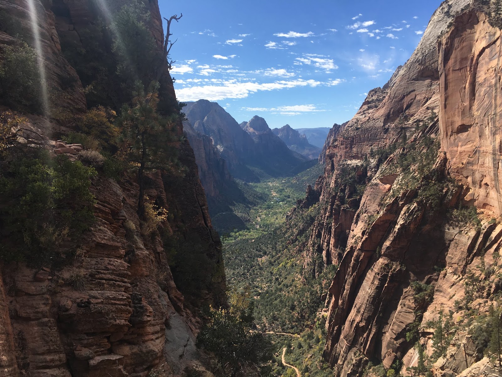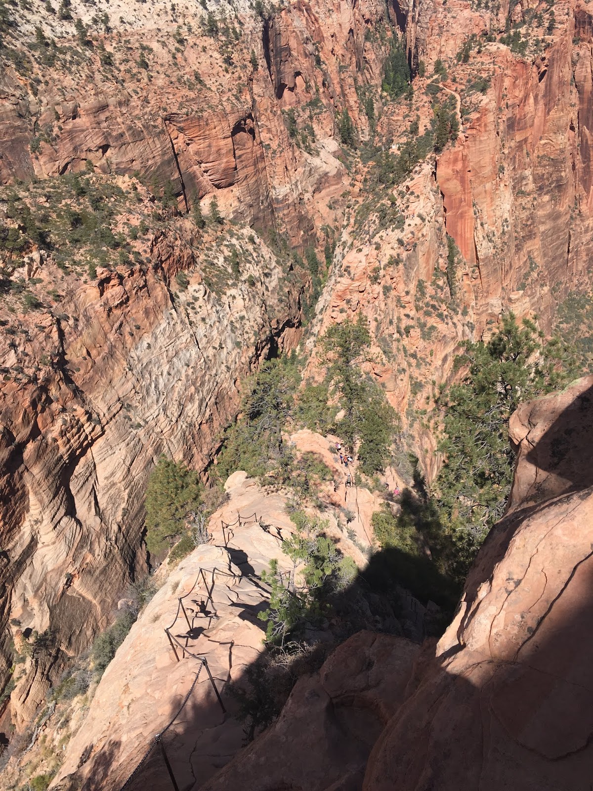 需要手腳並用的景點, 走上稜線之後會有一段路走在瘦稜之上, 有些路段只能一人通過, 不適合有懼高症的人, 搭乘公車至The Grotto站, 會走一小段The West Rim Trail, 至岔路口向右走即是通往Angel's Landing的終點, 而Angels Landing公車站則是在河邊欣賞山勢