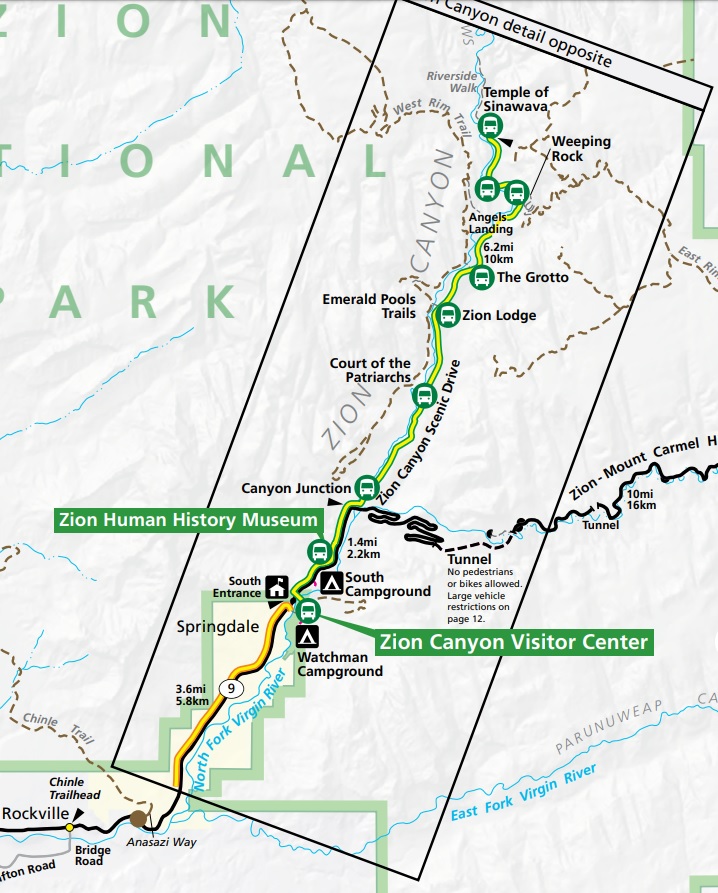 整個Zion國家公園的範圍是很大的, 一般遊客會來玩的就是上圖的區域, 雖然看起來小小的, 但是很值得花上幾天的時間在裡面閒晃, 圖中的路線大致上可以安排三天左右的行程, 主要景點是Angel's Landing和The Narrows(位在最北端公車站的北方), 這兩個景點大約會花上半天的時間, 其餘的時間可以去逛逛剩下的景點和Springdale小鎮, 都是不錯的選擇, 每週晚上也都會有一天的時間舉辦生態講座, 英文能力尚可的人可以去聽聽看