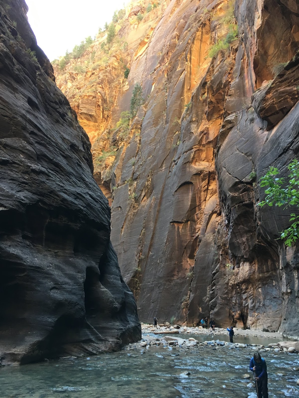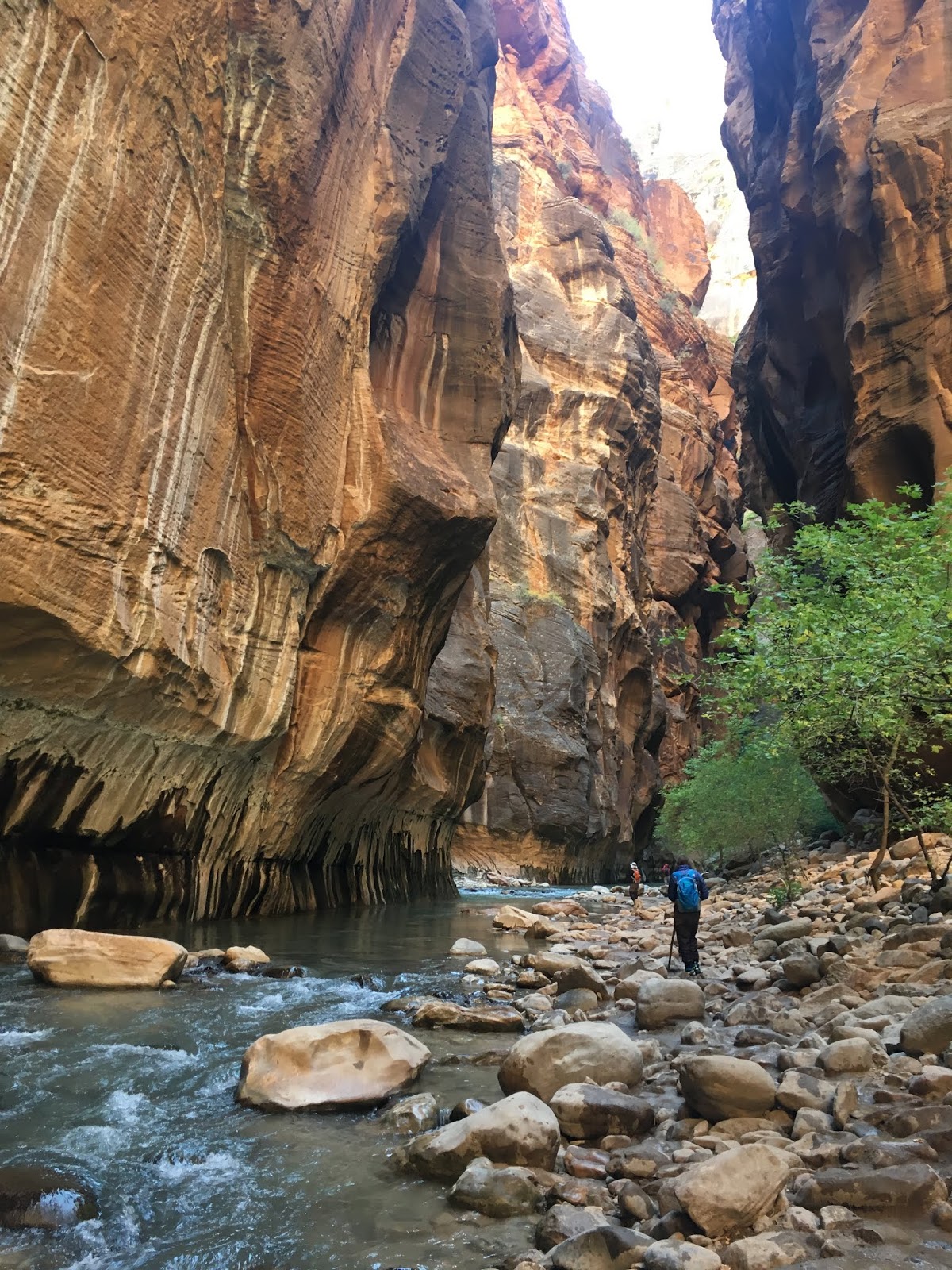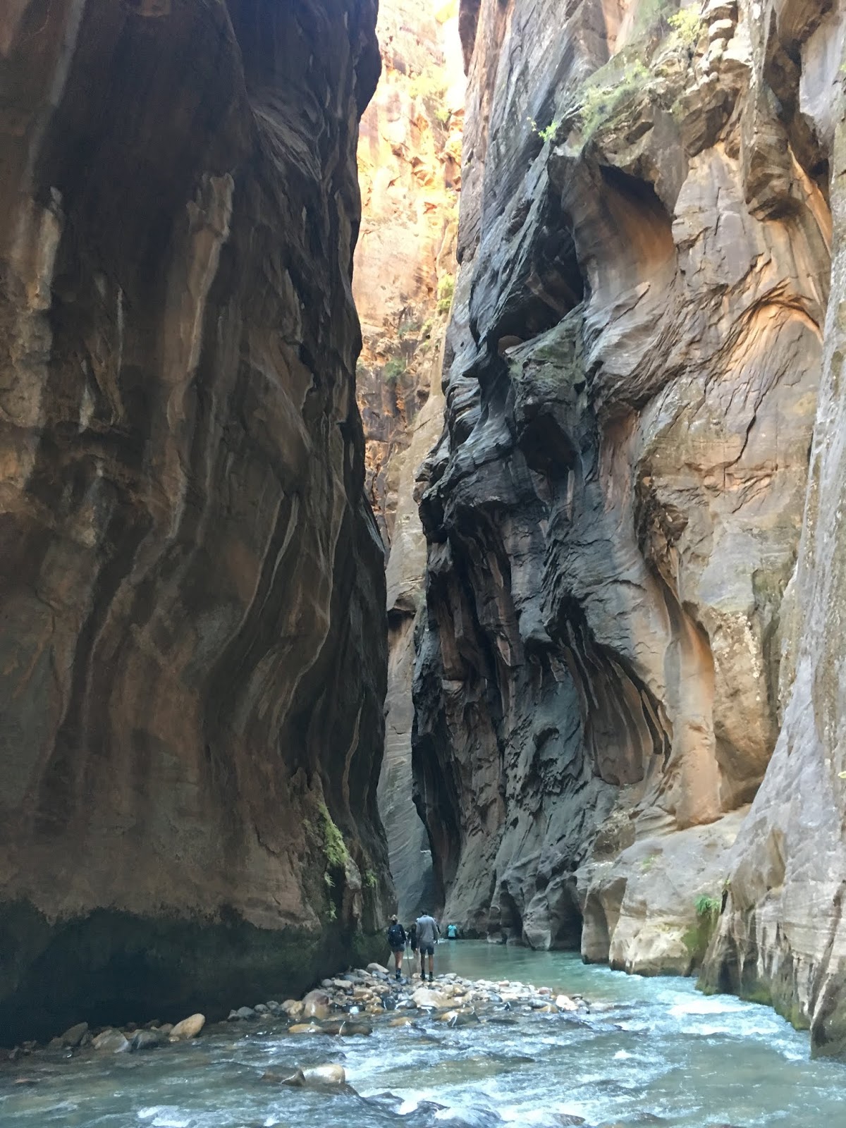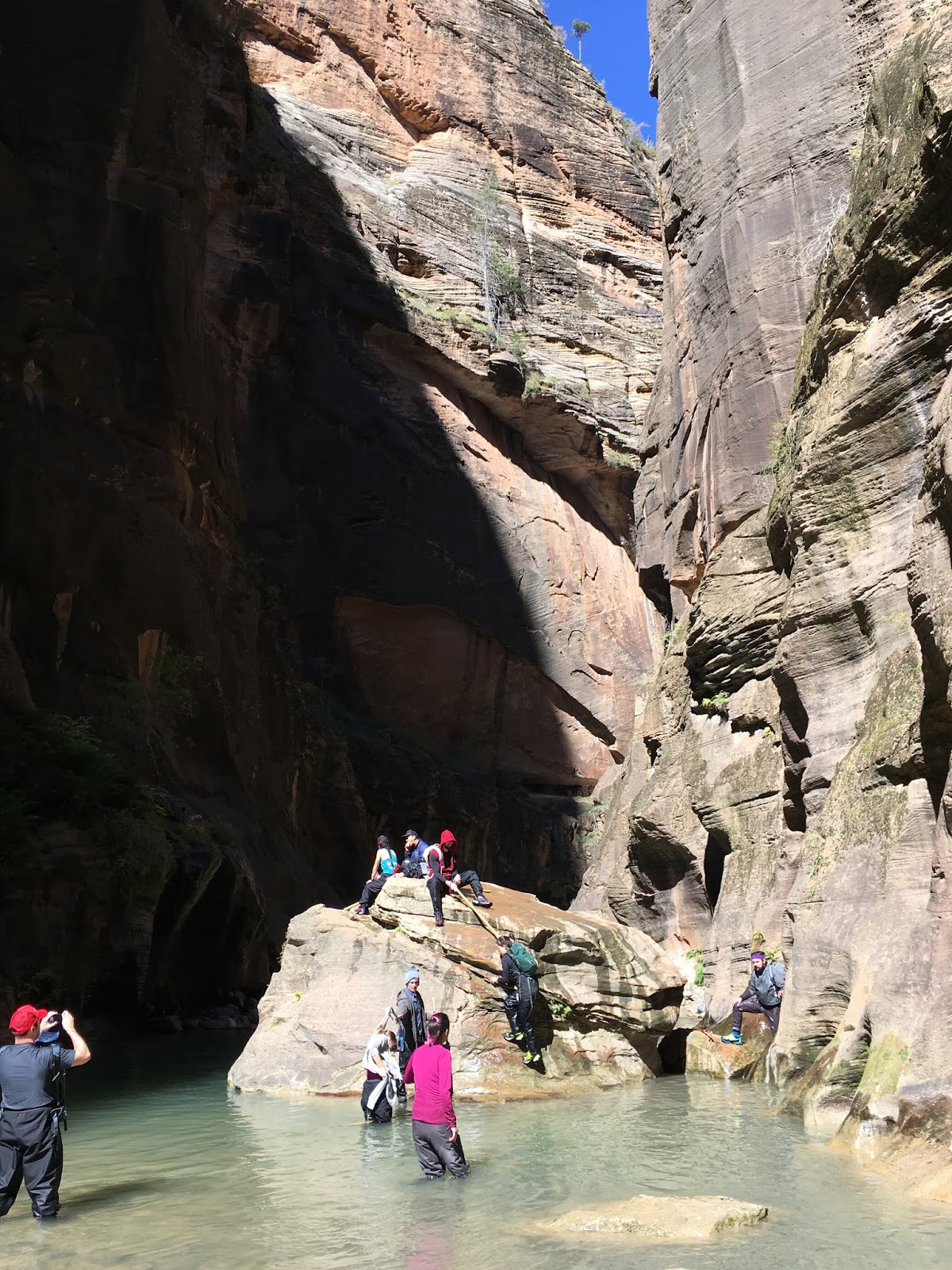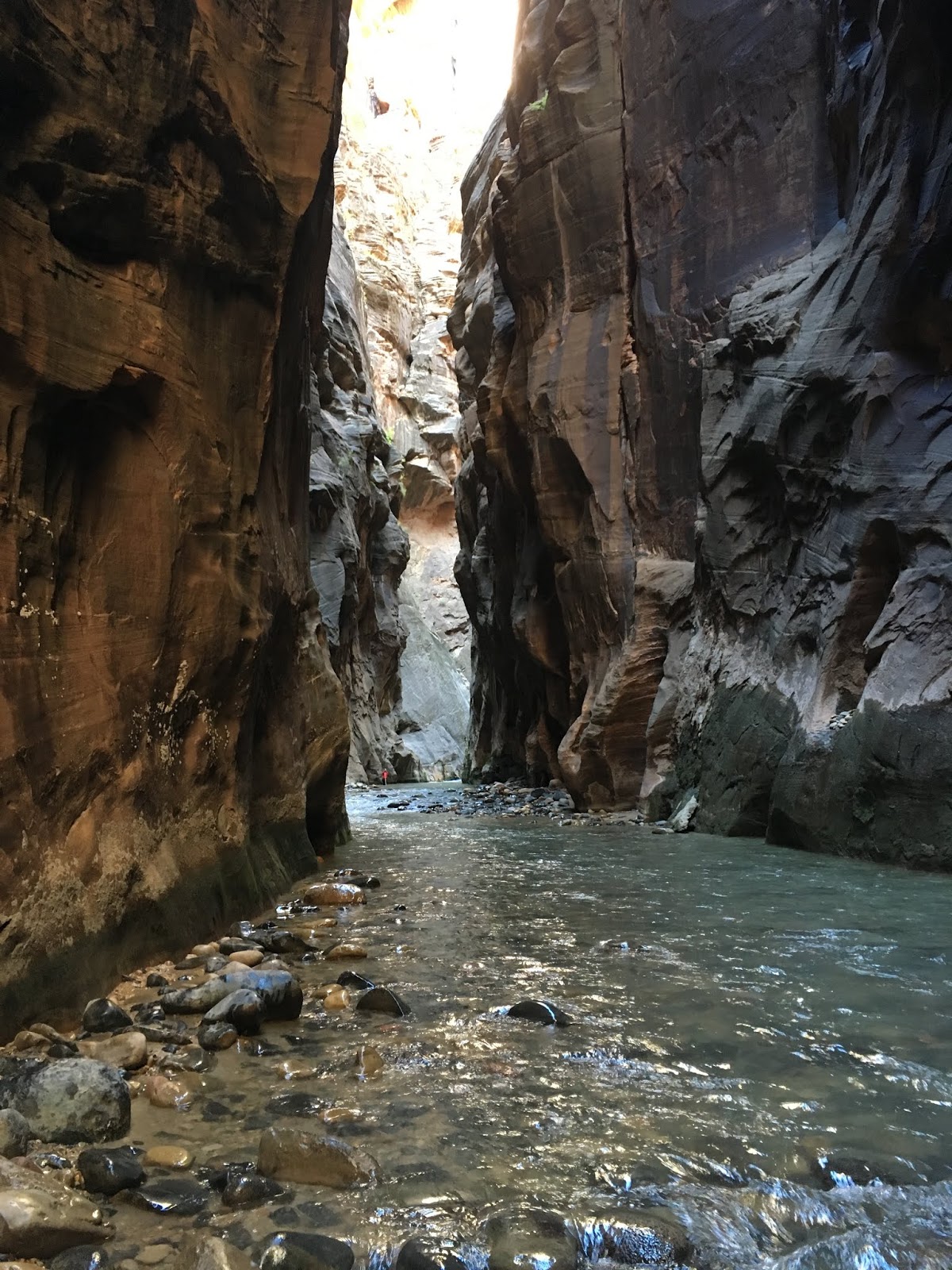 Zion最著名的景點之一, 路線中最窄的區域大約2公尺, 搭乘遊園公車來到最後一站, 沿著Riverside Walk走到水泥路的盡頭就可以開始涉水, 建議攜帶雙杖, 保暖鞋可有可無, 不過怕冷的話建議去租, 在接近折返點的地方水會開始變深, 需要稍微游泳的程度, 除此之外水深大致上都在膝蓋之下, 在沒有Fresh Flood警報的情況下可以在裡面安心玩水, 只是要注意不要泡水泡太久失溫, 畢竟峽谷內僅有少數區域可以讓陽光直接照射取暖