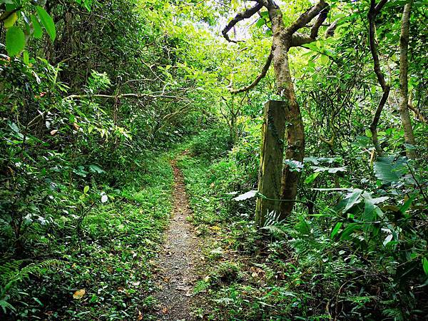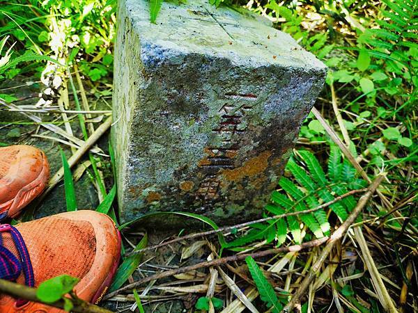 11:25 三角點,要到三角點之前,路會在牆邊的上頭,要稍微小心一點,千萬別摔下去了,這樣就尷尬了,另外,想要找一等點的話,需要再往前3公尺的左手邊的草叢中,不過這裡的展望就沒那麼好的。在這邊拍照之後,小休一下就下山了。