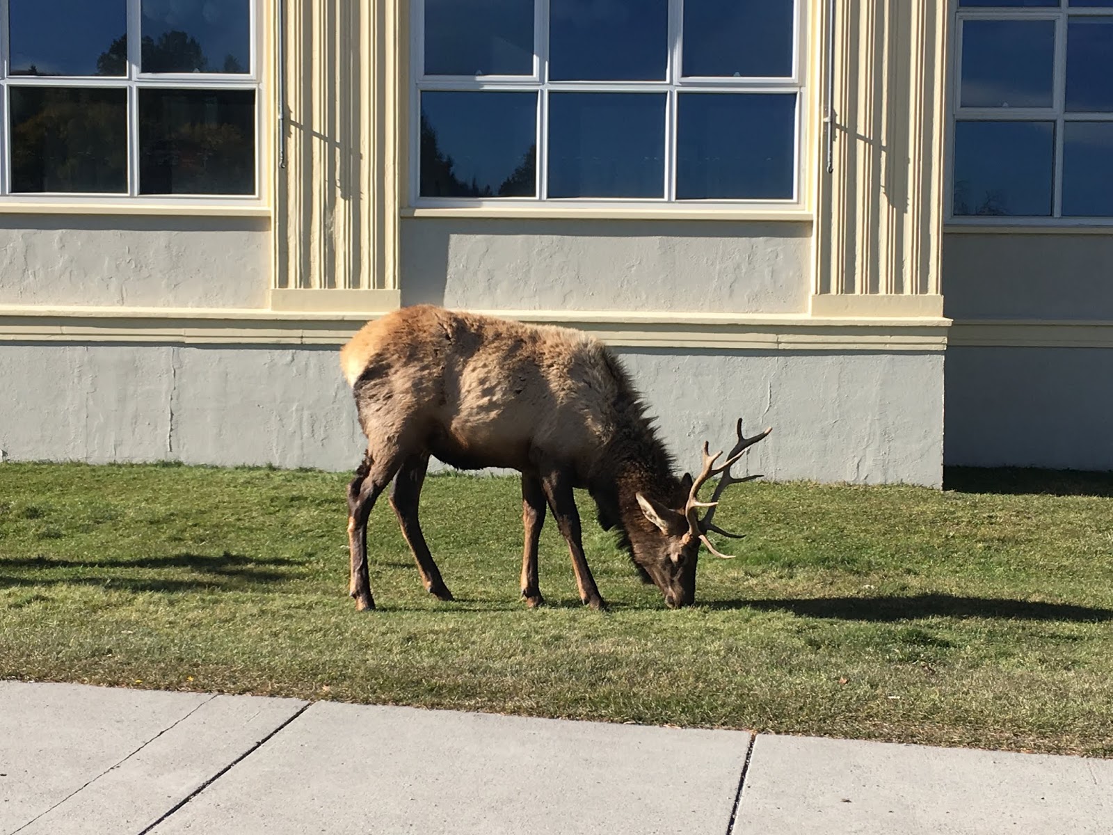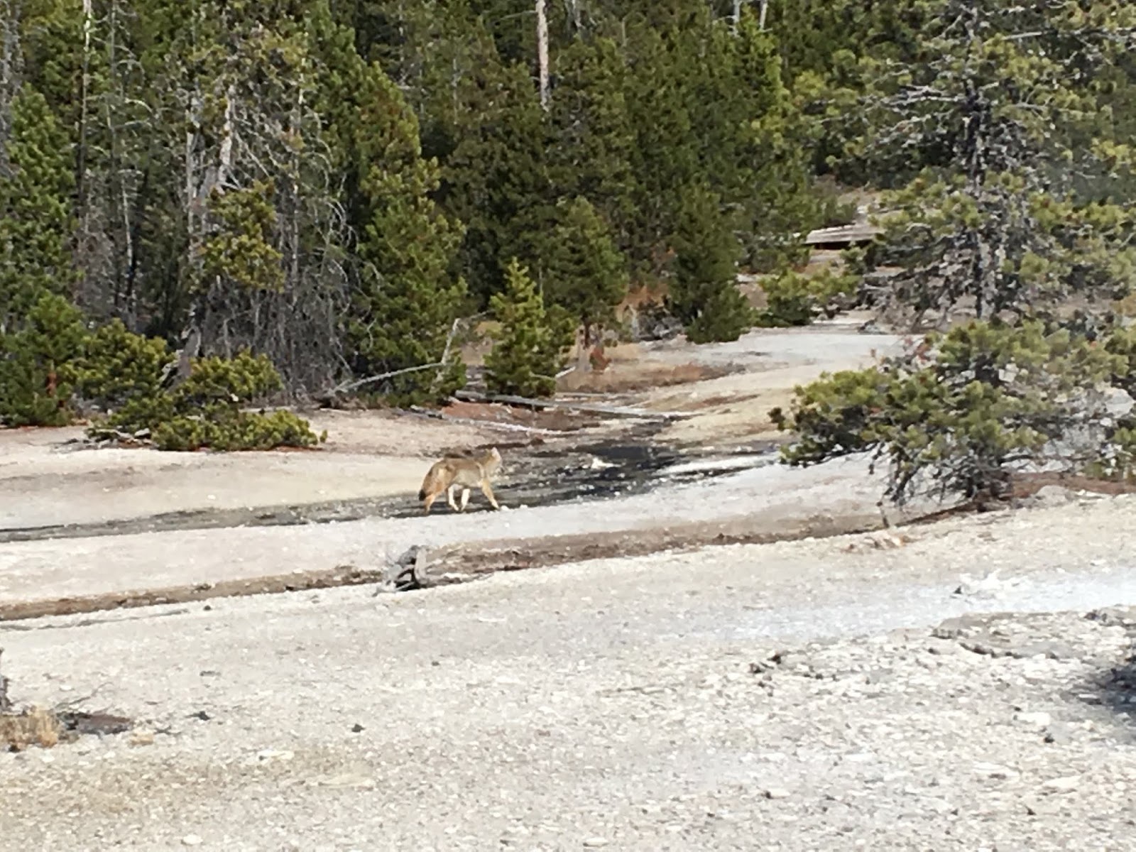 黃石公園裡的生態相當豐富, 部分動物也非常習慣人類的存在, 如果在開車走在園區道路發現塞車或是一堆人站在路邊, 就代表附近有動物出沒, 最常見的就是美國野牛Bison, 雖然看起來很溫馴但是還是不要太過接近比較好, 野牛的身高大約跟一般的房車差不多高, 也會在馬路中間散步, 遇見的時候就安靜的欣賞野牛的風采就好, 不要按喇叭催促他通過, 另外也有遠遠的看見疑似狼的身影, 在Gardiner也看到一大群麋鹿在街上吃草, 要注意的是麋鹿也是有相當的殺傷力, 一般母麋鹿的衝撞就會造成人類受傷, 更不用提公麋鹿頭上大大的角, 也是有把人刺到肚破腸流的案例, 所以也是不能太過靠近麋鹿的