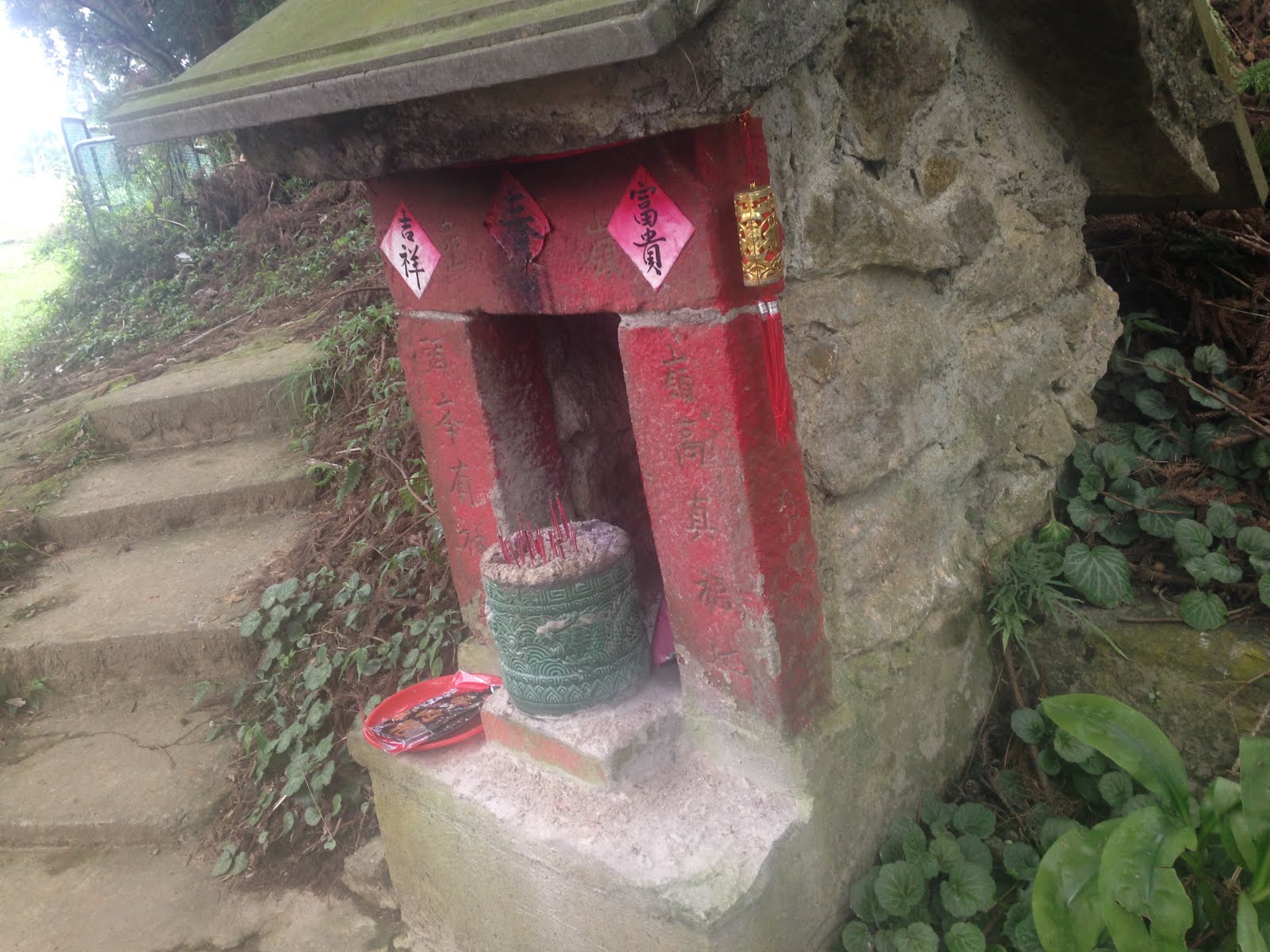 從擎天崗遊客中心上來看到第一個景點為涼亭及嶺頭喦(岩的古字)土地公廟。
