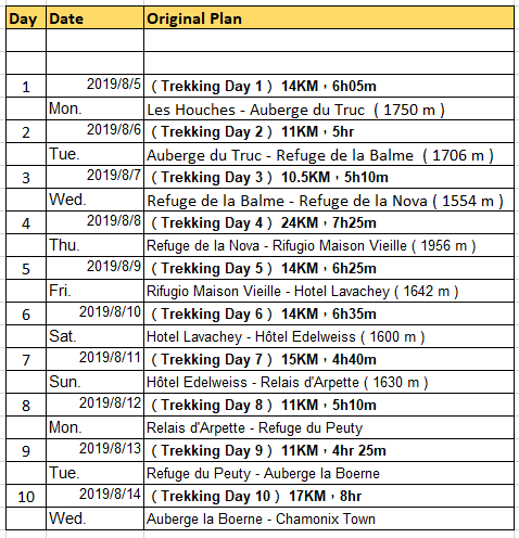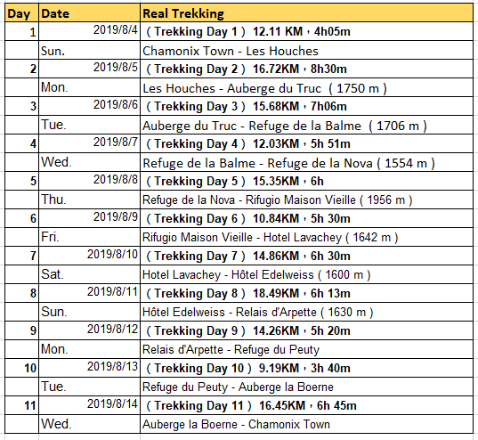TMB環白朗峰大環線之行,在確定要出行時間後,也規劃了10天的健行日後,接下來就來看看每一天的健行安排。