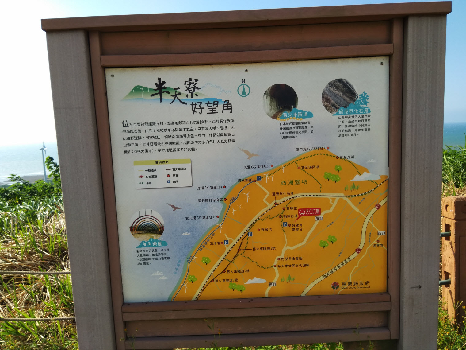 好望角是一處靠近海岸線且擁有絕佳視野的台地,依稀記得2011年的高中同學會後,一位家住後龍的同學帶我們前往該處,印象中當時還沒有像現在那麼多攤販、遊客聚集在此處,也沒有規劃什麼公設如廁所、停車場等,只有陣陣吹來的海風及孤立在此處的舊砲塔遺址和風力發電機,少了點喧囂但多了些許的寧靜,是一處遺世獨立的秘境! 這一次打算實地走步道探訪附近的景點,從好望角出發,再串聯附近的舊鐵路隧道、過港貝化石層,來一段不一樣的歷史古蹟知性之旅~