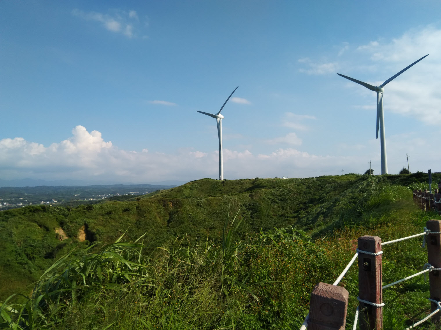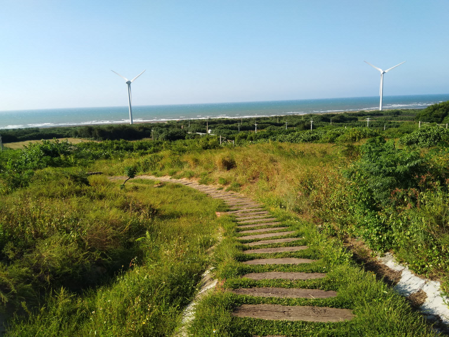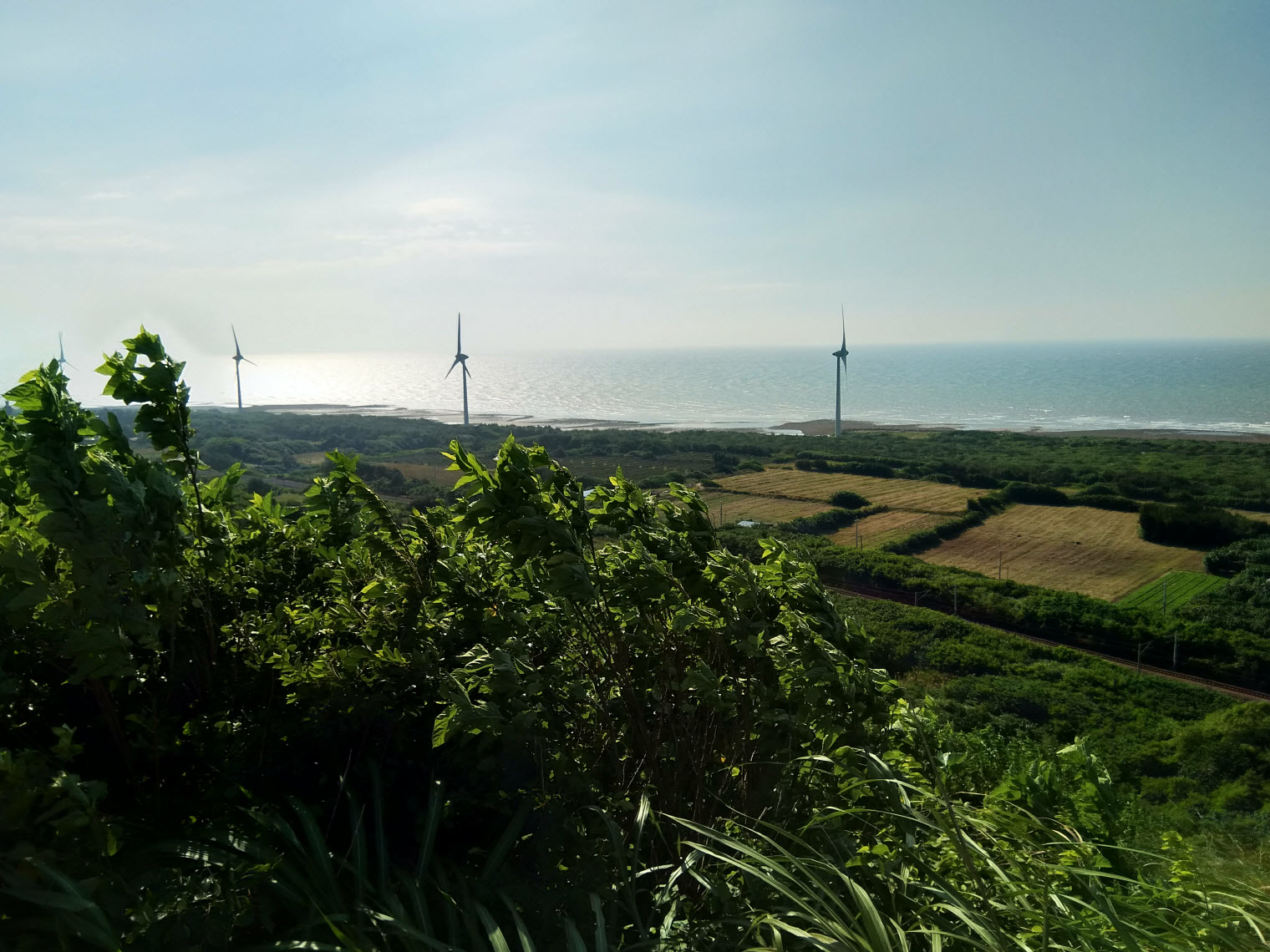 在另一視角上,由草坡、濱海、鐵軌、風車所構成的景致更是唯美得像一幅畫