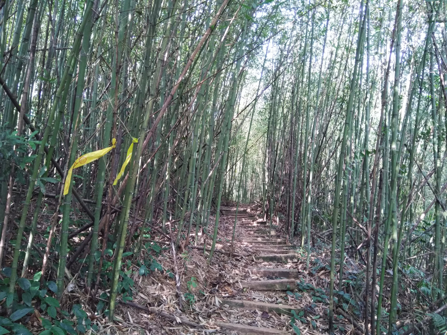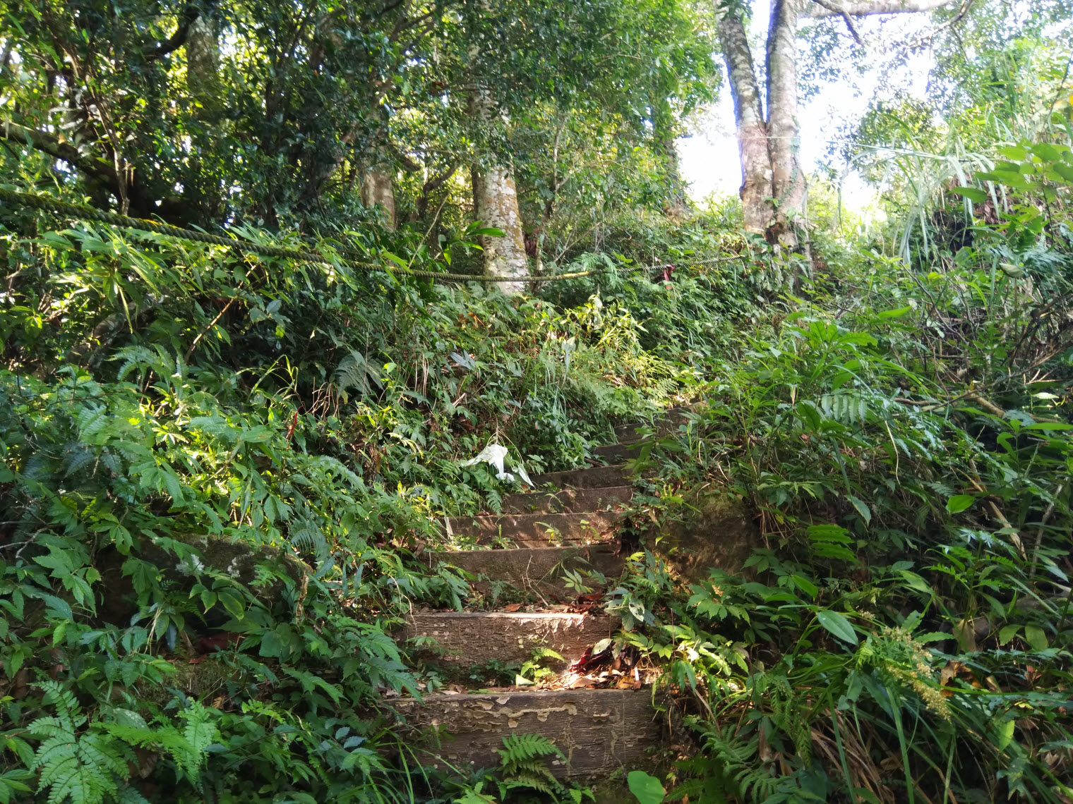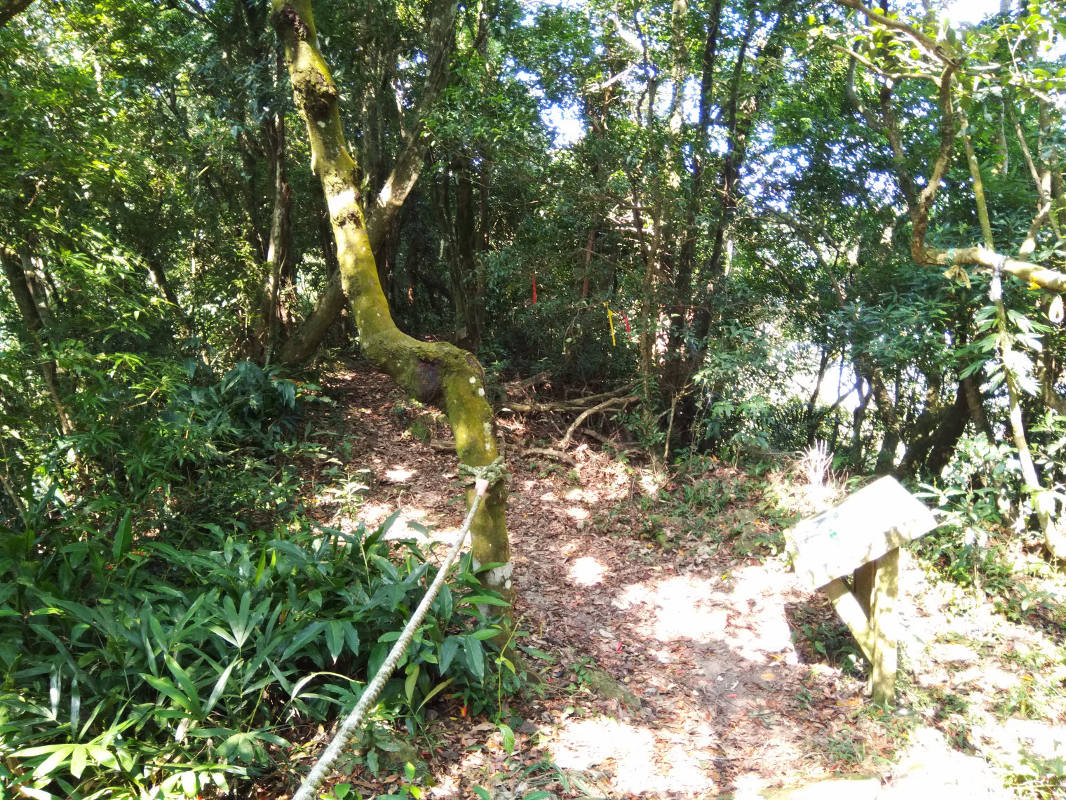 接下來這一段的山徑都有個特點,路上的草、竹葉等你能夠看到的植物,感覺身上都裹了一層水,雖然目前只是微弱東北季風吹拂的秋季,但加上近期至少一個月內無雨,應該蠻乾燥的才對! 說是早上的露水也感到有些不可思議,難怪有山友提及這裡須留意螞蝗的蹤影,不過走一趟下來似乎都沒在手上瞧見,也許需要更濕又悶熱的夏季吧~