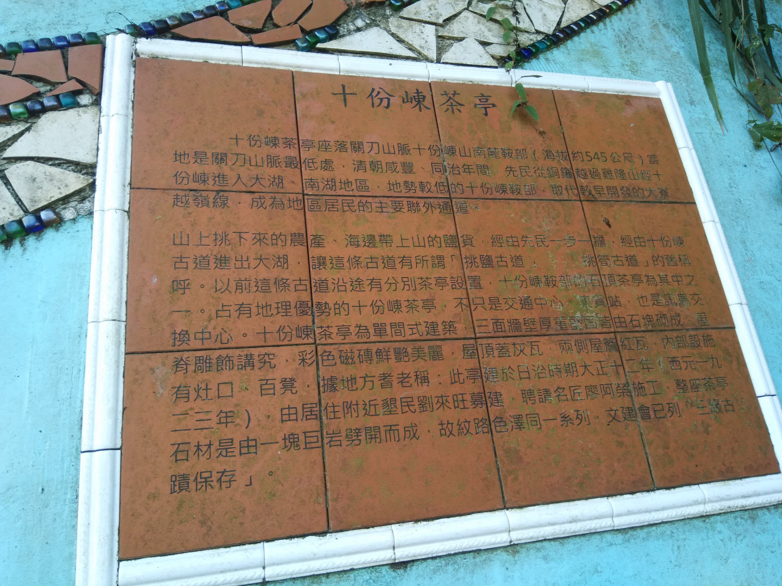 行走感想 - 走這一趟十份崠古道讓我了解到早期先民跋山涉水的辛勞,好加在途中設有茶亭,使得先民們可以在此休息、寒暄,或許還可以以物易物做些交易耶~ 現今的茶亭已被縣府設為古蹟,有機會來走出關步道時別忘了來看看這座古樸的老茶亭,它見證的是百年來這裡的變革,極富歷史價值。