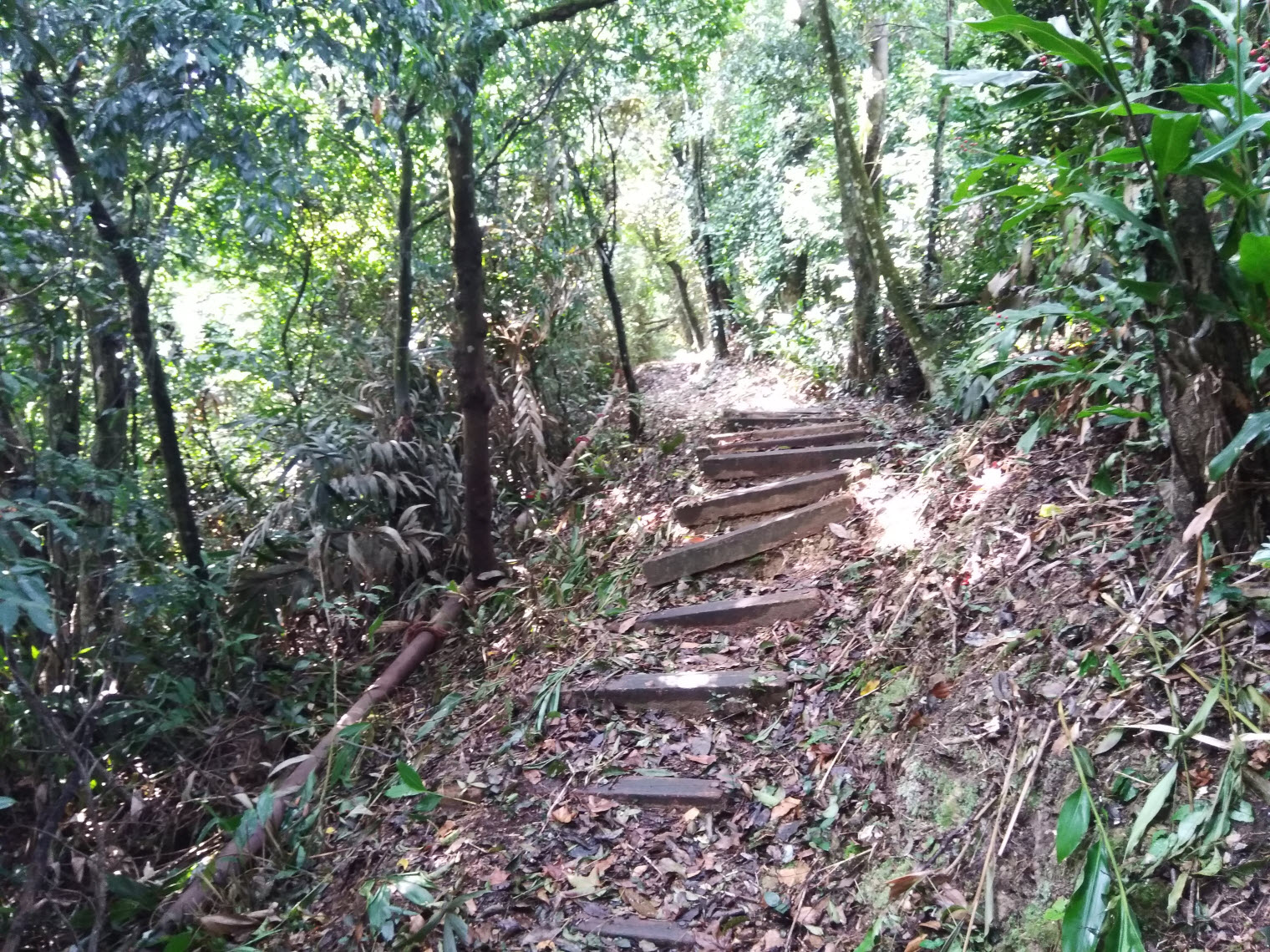 過了3K的里程樁,一段的下坡路徑看到不少的工人正在鋪設階梯,當下只能踏過尚未鋪好的石塊,過了施工區後開怪手的大叔還跟我閒聊一番。在此也看到他們有透過一台迷你型的運輸工具來運送石塊,畢竟這條山徑車子是開不進來的。此時依循指標往觀雲樓前進~