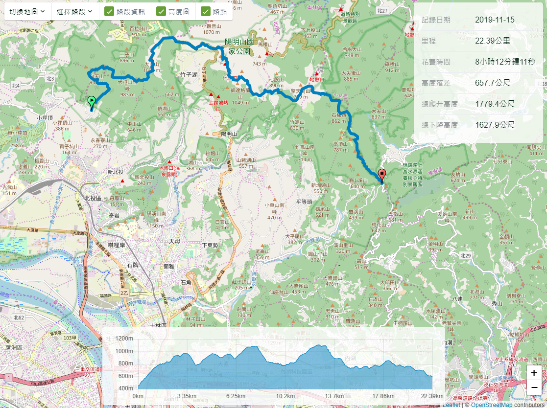 以今年來說,因為竹篙山目前原縱走路線被封,需特別繞路才能登頂,另外就是擎天崗仍然因為牛隻傷人事件,尚未開放原來的可走至風櫃嘴的步道外,其他只要根據原縱走的路線都可以順路經過。下圖是東西縱走的軌跡與爬升圖,可以觀察到走完陽明山東西縱走,難度幾乎等於單攻走完一座志佳陽大山了,它們有差不多的爬升與下降高度,只是陽明山東西縱走的距離比較長,而且普遍來講,我認為陽明山東西縱走比較難走,因為石階路踢了一整天,真的會腳痛到很想死....XDDD