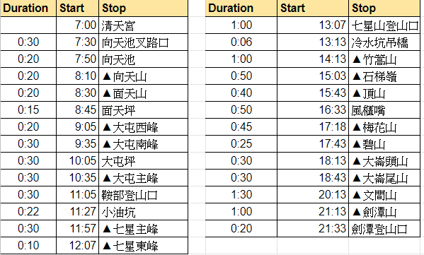 當初雖然有軌跡可以下載,可是還是很難有個類似上河速度的時程來比對自己到底能不能走完這整段,於是找了一些資料,以及沿途一直比對自己是否速度有落後。這次走完,修正了一些時間,感覺這資料很適合讓大家當參考,以下的時程圖,就提供給大家當參考囉。:)
