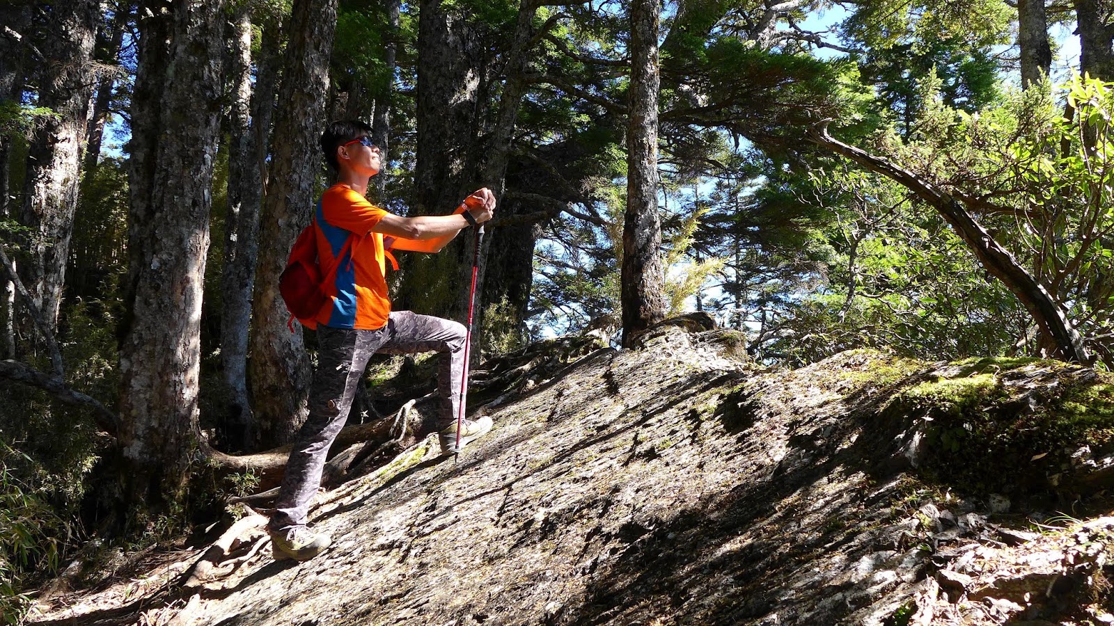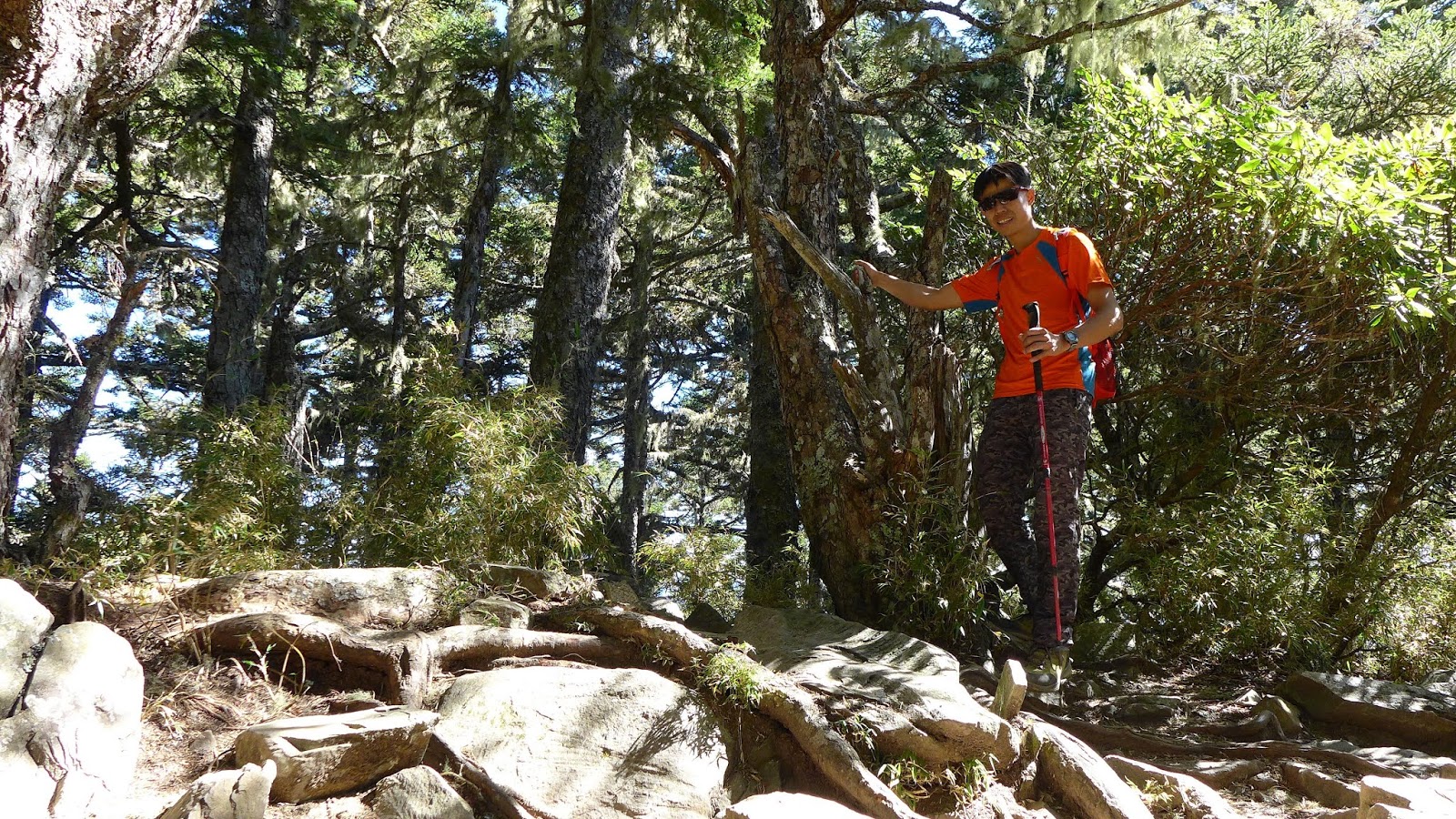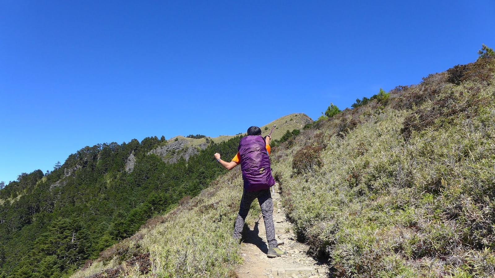 這裡再次遇到昨天在喀拉業見過面的男女山友,彼此打招呼小聊一下,互相道別後,回到山屋,稍微休息一會,主要目的都完成了,把大背包整理好,腳架用不上了也收一收,啟程下山,到池有名樹前一段較陡的爬坡爬過去,到三叉營地開始就是一路下坡了。