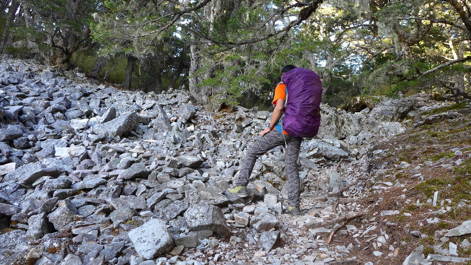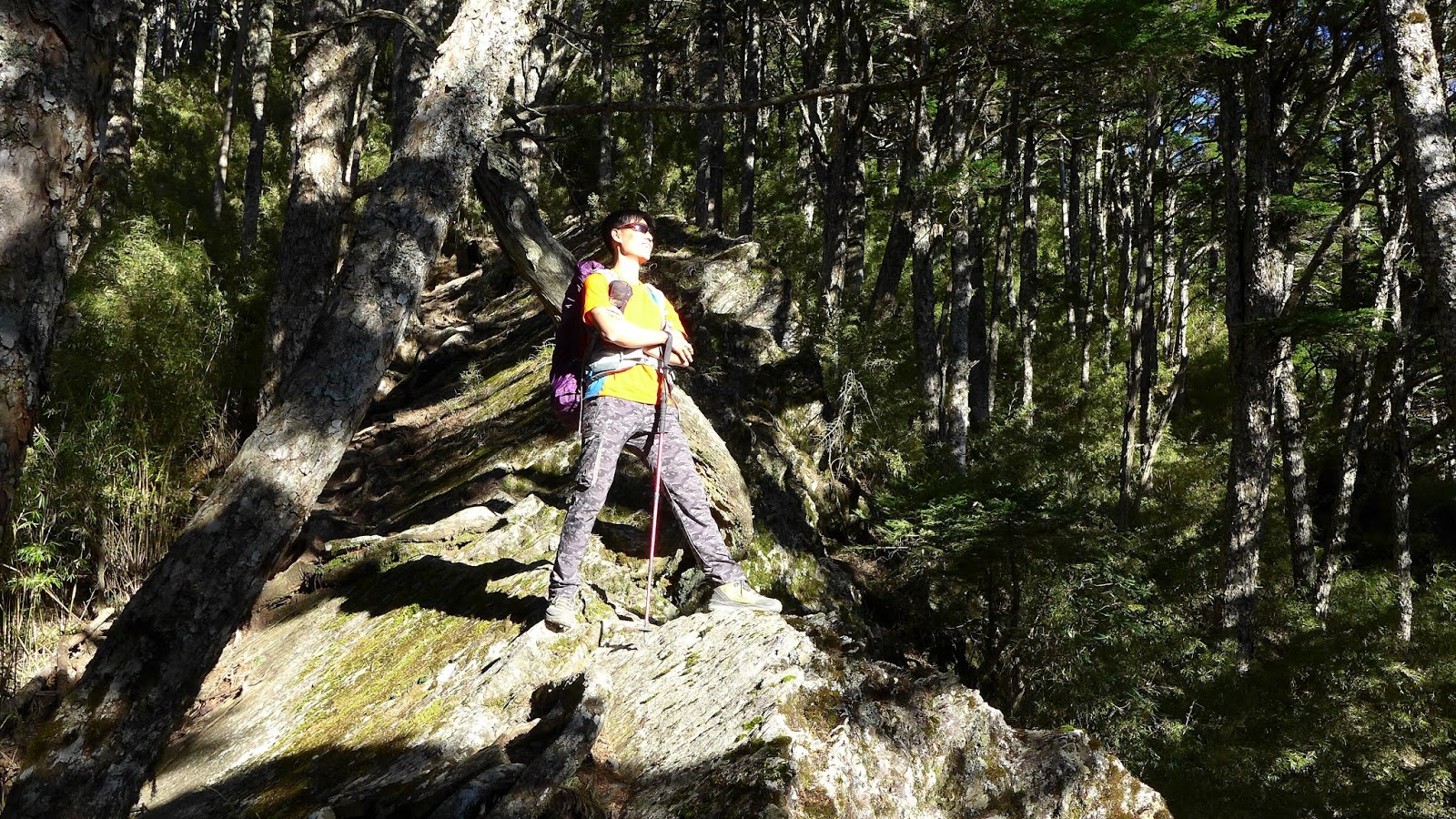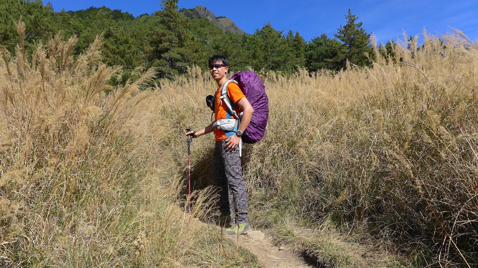 這裡再次遇到昨天在喀拉業見過面的男女山友,彼此打招呼小聊一下,互相道別後,回到山屋,稍微休息一會,主要目的都完成了,把大背包整理好,腳架用不上了也收一收,啟程下山,到池有名樹前一段較陡的爬坡爬過去,到三叉營地開始就是一路下坡了。