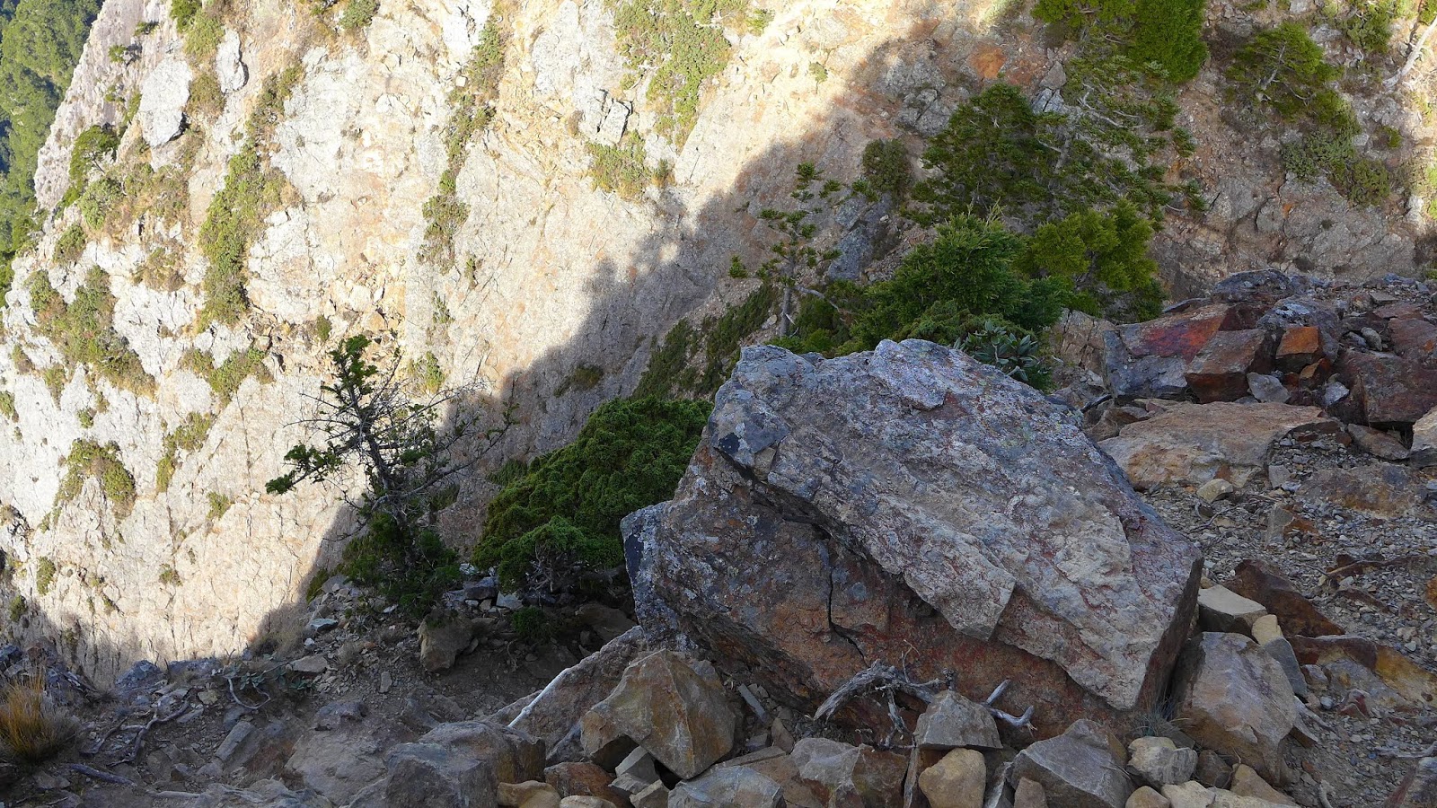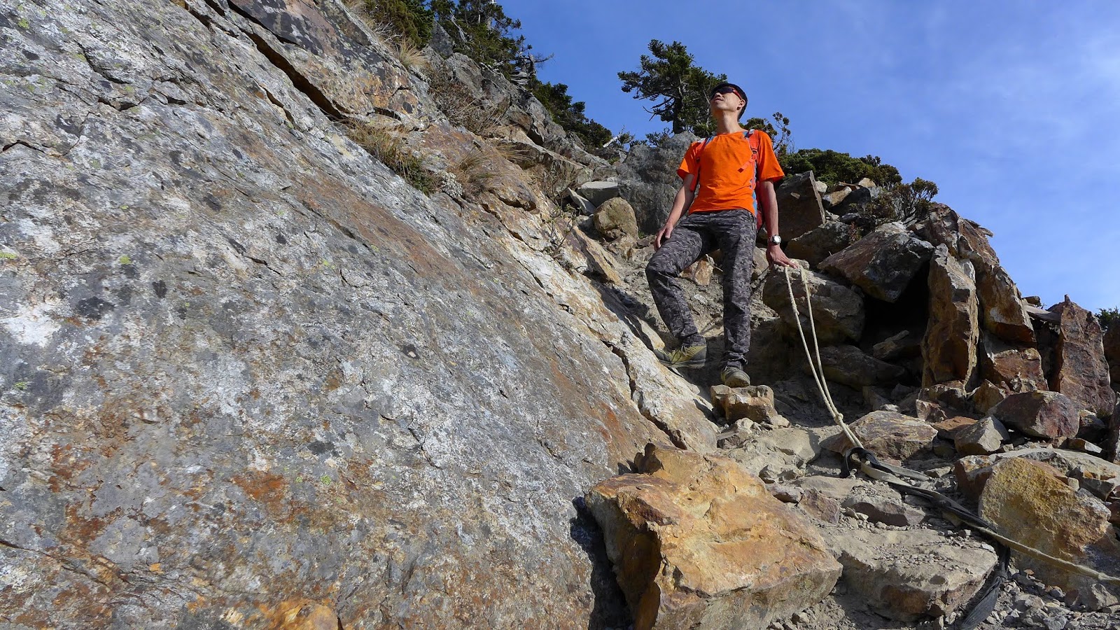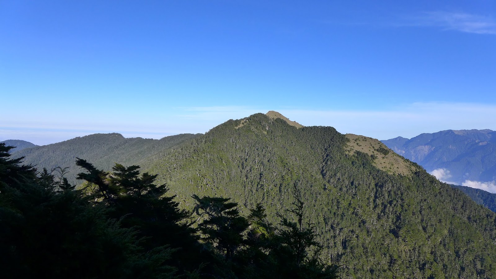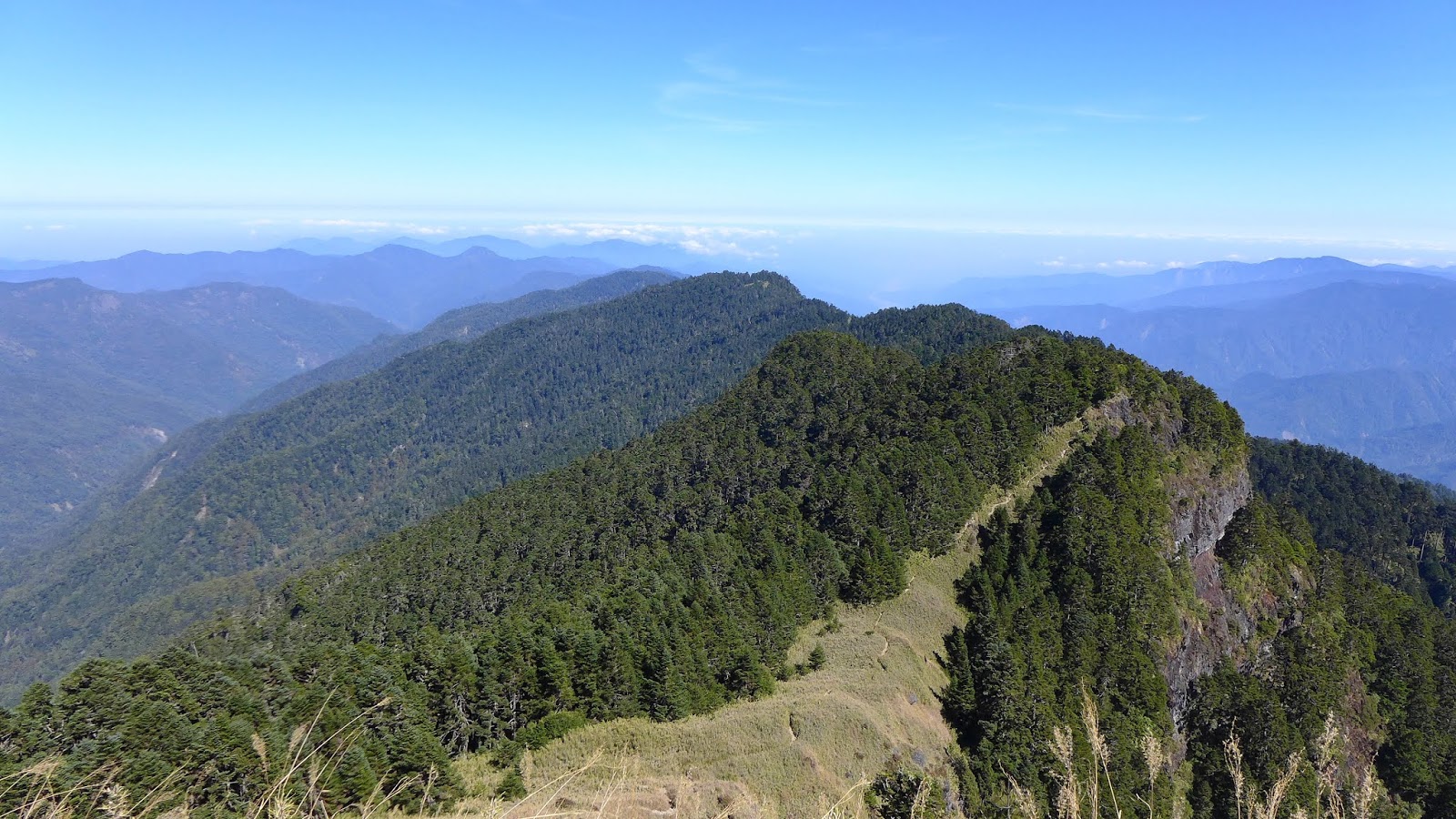 藏好背包後看一下剛下來的路,走下來時就知道很陡,但喀拉業山會讓人哇哇叫的原因,就是因為來回距離很長外,還要再爬上去,剛登頂桃山時,正好看到一組人馬從下面往上爬,明顯可看出有幾位已經走到眼神死。