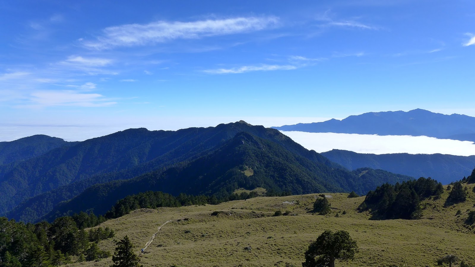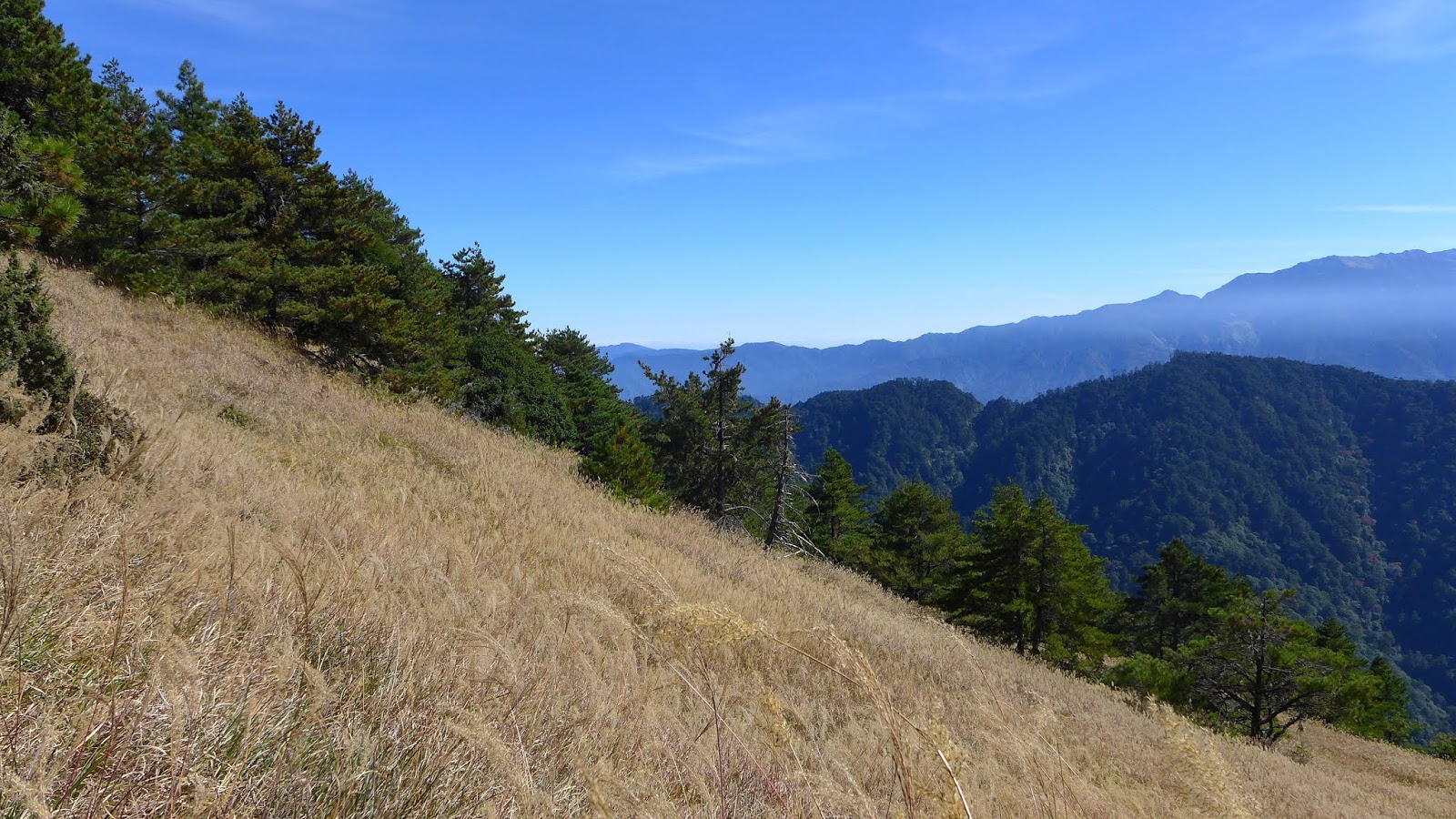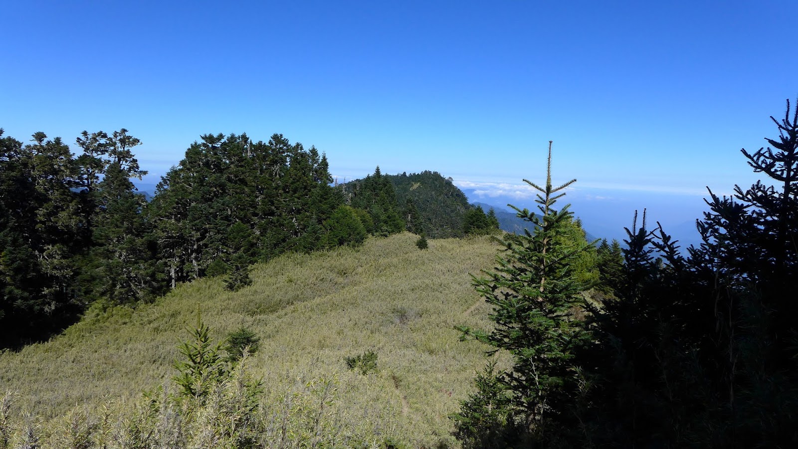通過詩崙山不久,會離開樹林,眼前是箭竹草坡,從這到喀拉業山起伏沒有剛開始那麼大,算相當好走,沿途景色也不錯。