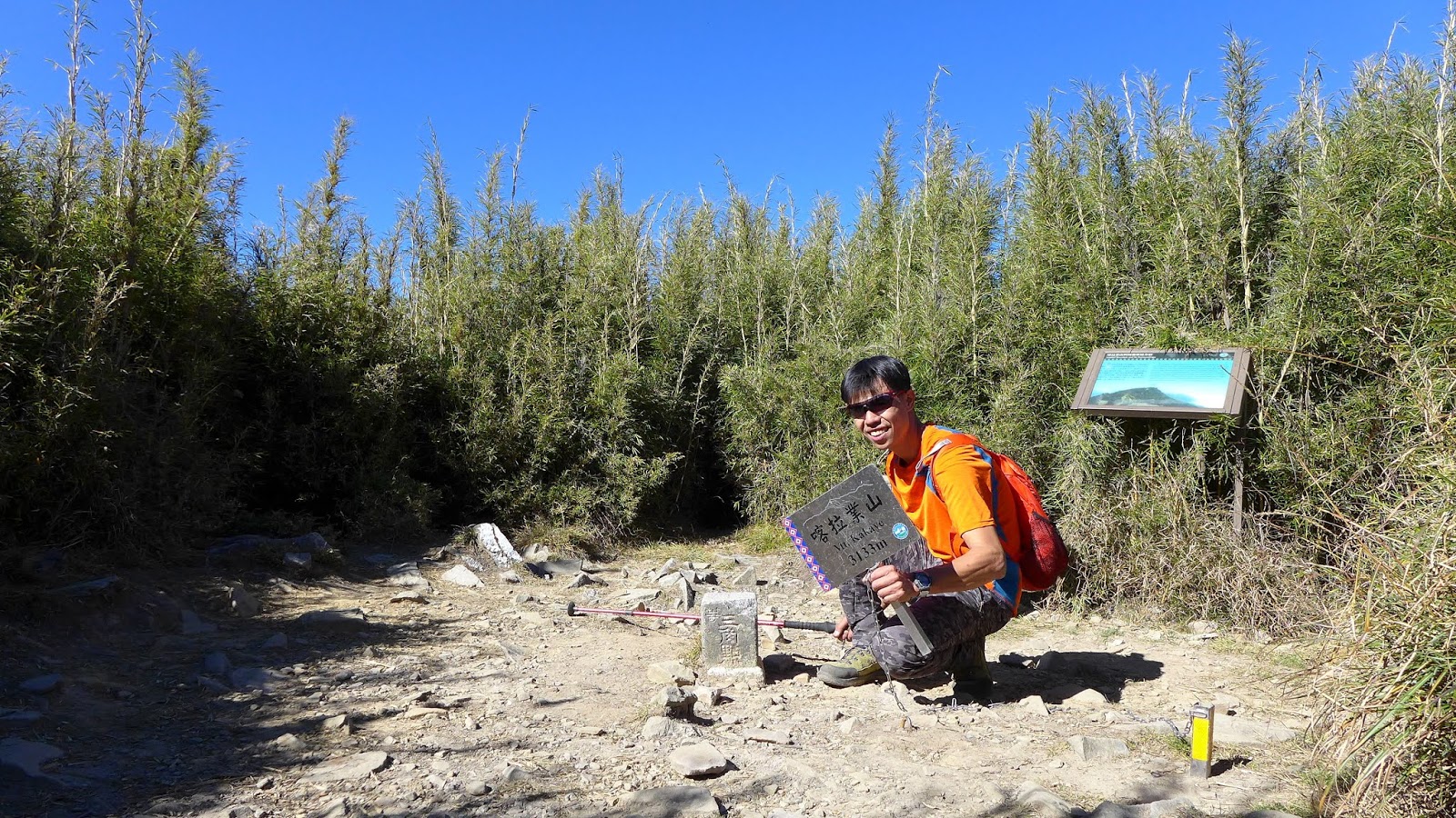 再來要去喀拉業山,單程來回7K,山頂拍完照稍休息一會,馬上動身,原本想去桃山山屋放大背改小包,但懶得走下去再上來,乾脆直接背著開始下切,走大概200M多換成登頂包,大背包藏在箭竹裡,以GPS標注記號。