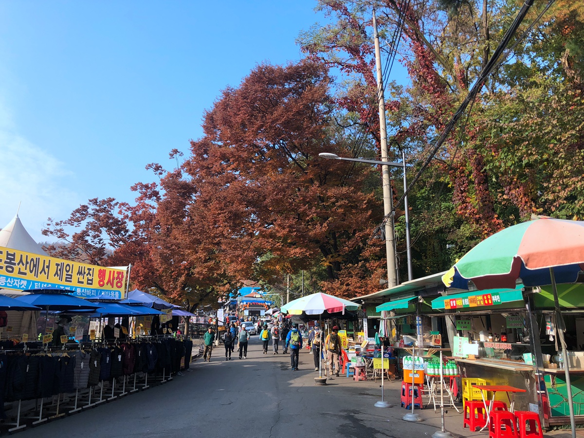 有點類似台灣的某些登山路線,有時在登山口附近會有小攤販出來擺攤。第一次去時,因為不熟悉這邊的登山環境,所以我都是跟在台灣登山的習慣一樣,出發去登山口前就會先買好早餐跟午餐,後來發現在某些山岳的登山口前其實是會有小攤販的,所以後來再去韓國登山時,我就會買備用的餐點(不一定要當天食用完的),然後到登山口看看是否會有小攤販營業,再決定是否要改買熟食上山。這幾次的經驗是,大多數都至少可以遇到有賣紫菜飯糰的小販。