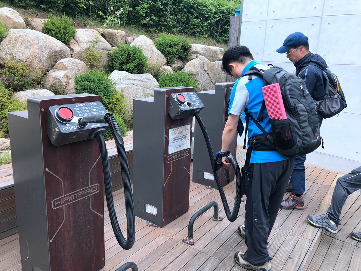 其實我也不知道該稱呼這叫做什麼,簡單的來說,它的設計很像是沖刷掉車子上沾黏灰塵的那種器材。這個設備純粹只會噴氣,藉由噴氣的方式,將你褲子或背包等物品上的灰塵沖掉,這是免費的喔。其實我在韓國爬過幾座山,這倒是我唯一看到的一次,也就是去爬北漢山的白雲台那一次,所以並非每一座山岳都有這種設備的。只是第一次看到,覺得好有趣,也去試用了一下(當時還邊拍沖刷的照片,結果被韓國人疑惑的看了一下...XD)。有時在國外爬山,會突然發現有好多新奇的設備的。