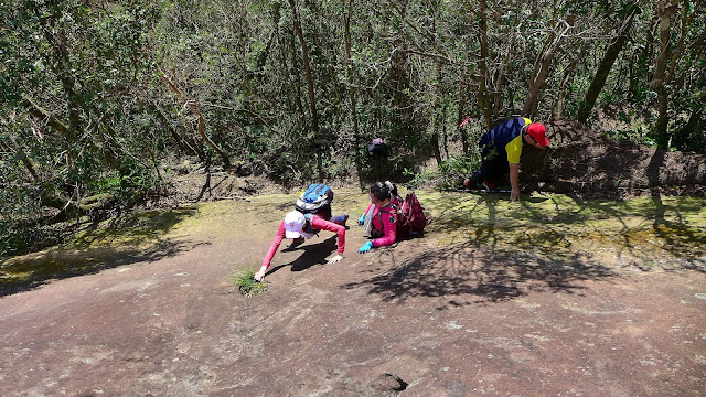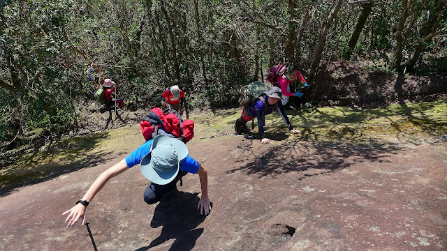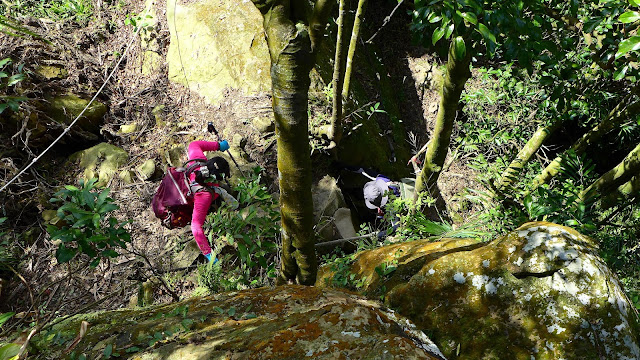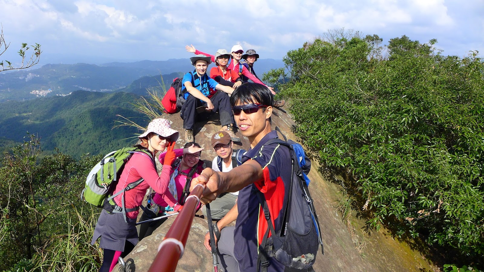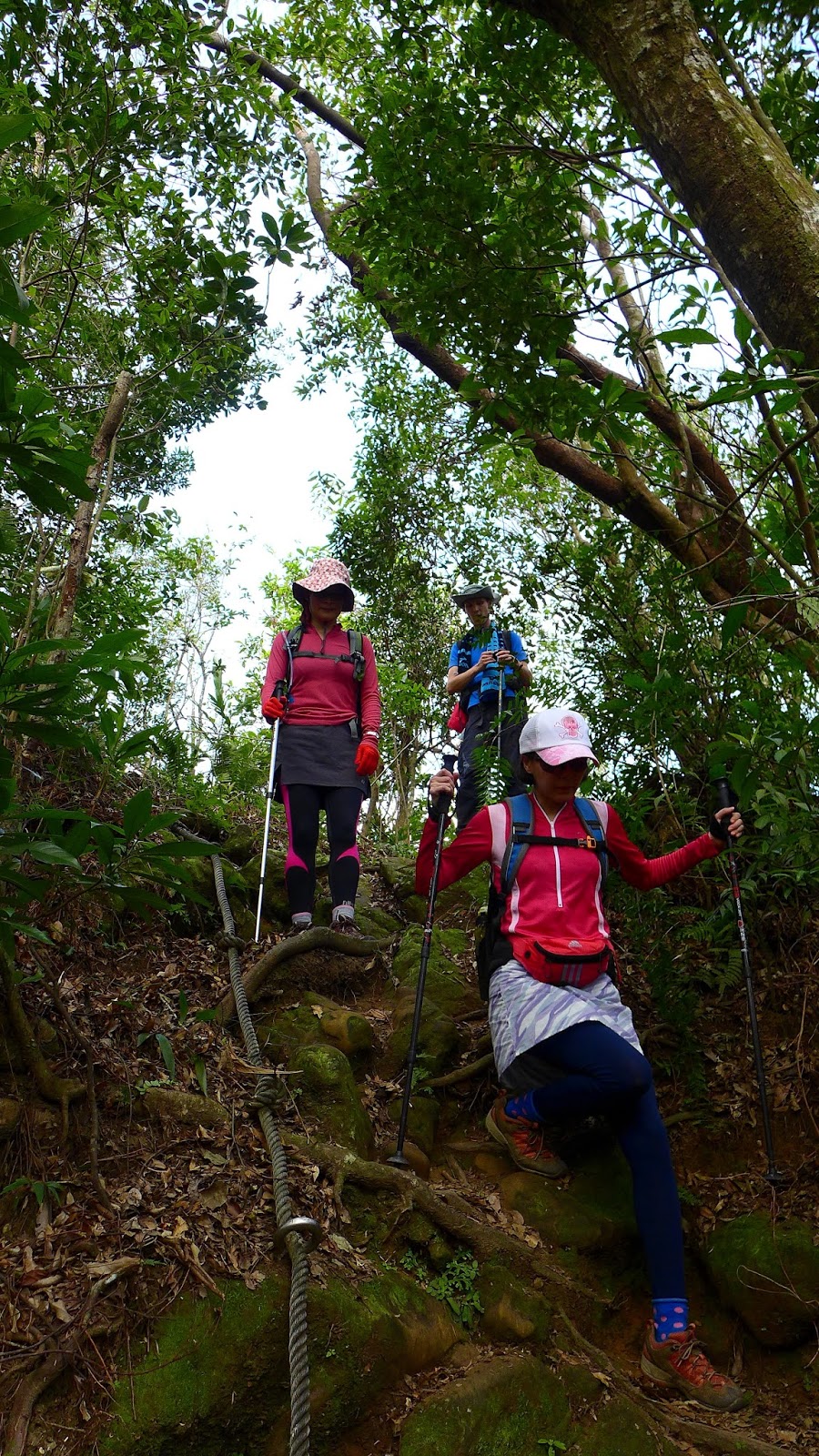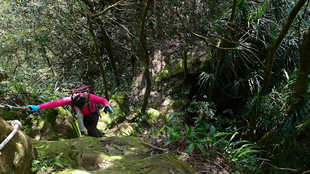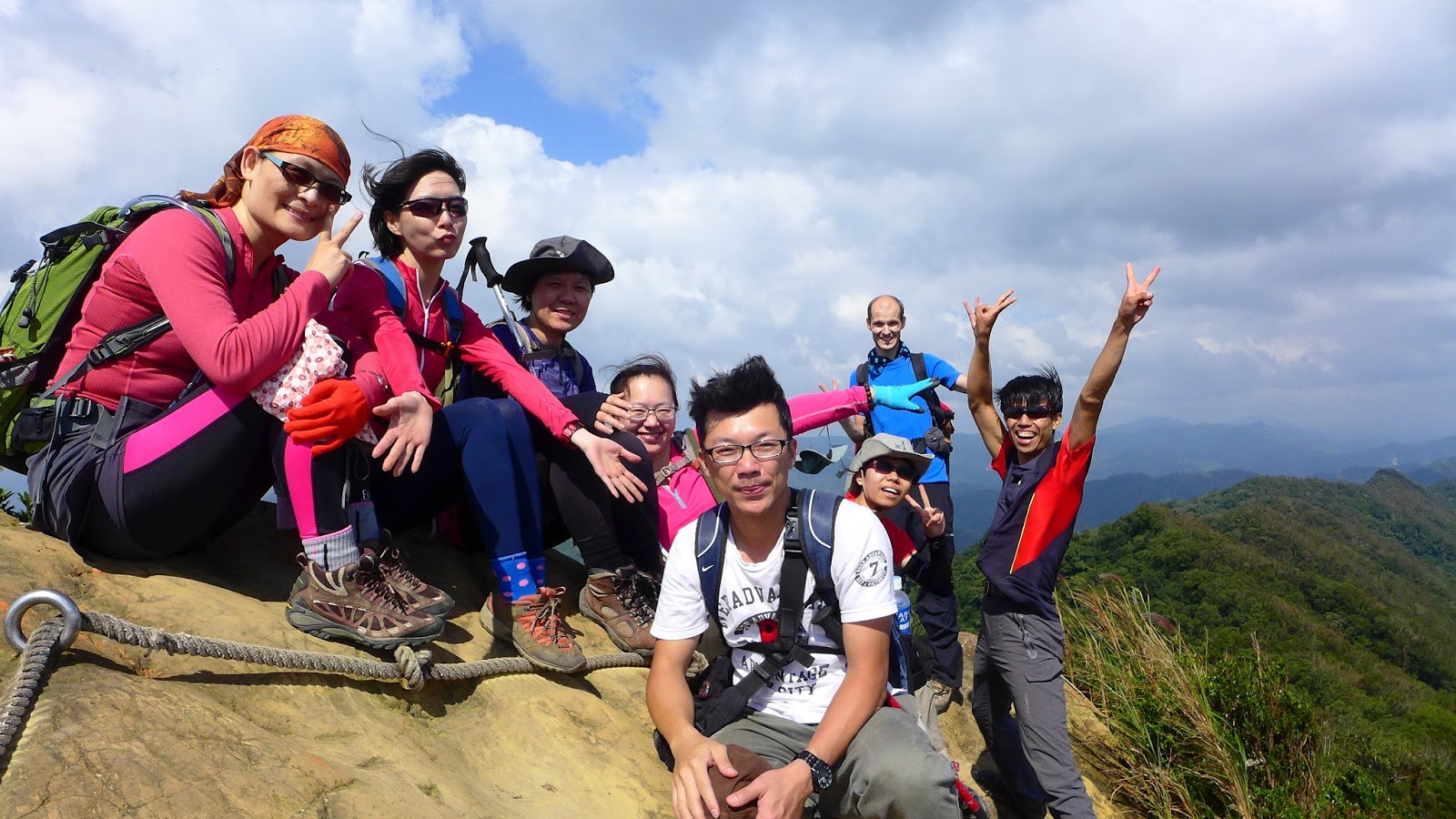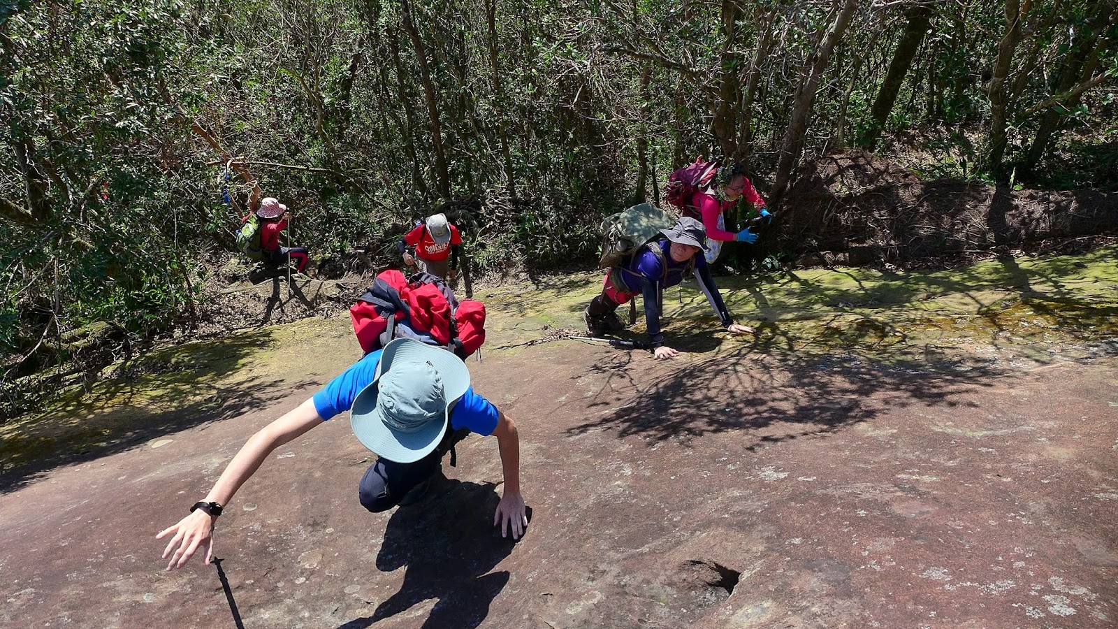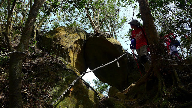 走著走著看到來到筆架山1峰的山腳邊,可直接攀上山頂,我先去試爬,手點好抓,如果沒把握可續走主徑到另一側有安全的拉繩路徑到山頂,這裡隊伍分2隊,我帶直攀徑,腰繞由我妹帶,分別到山頂上集合。