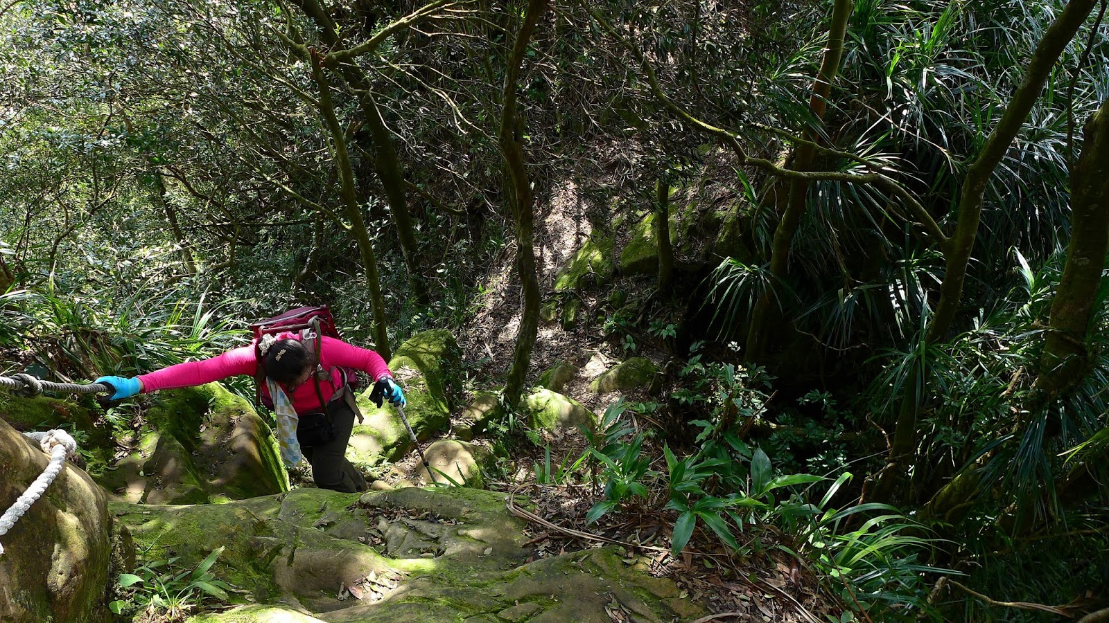 從石頭屋開始,連間連續上坡路到稜線,路面濕滑行走需當心,抵達稜線馬上就能看到岩稜地型。