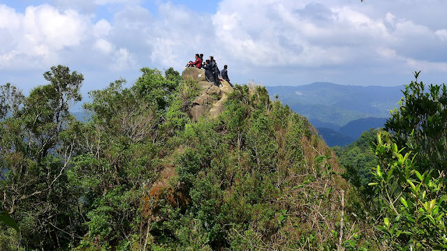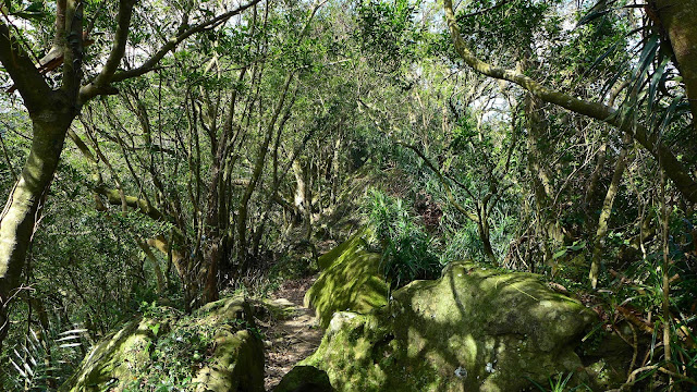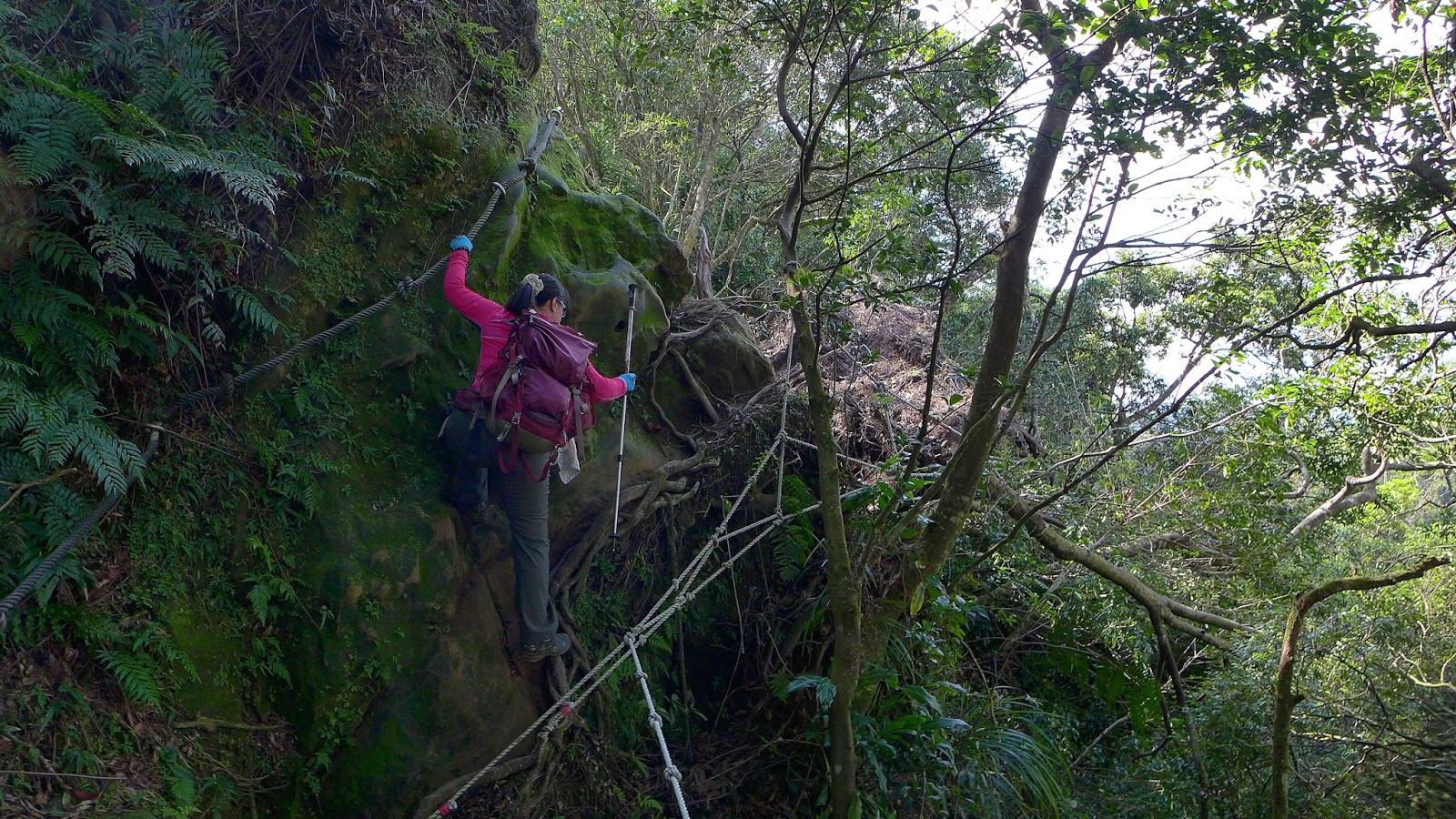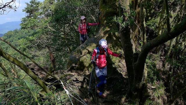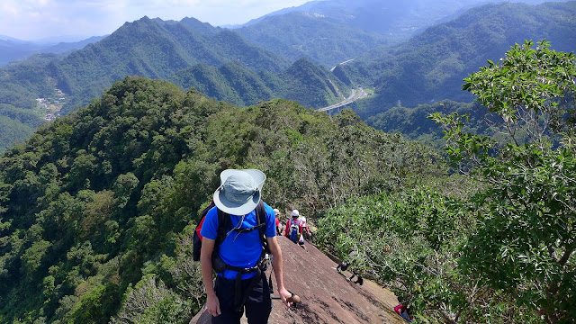 前往第一座山頭西帽子岩,稜線在樹林中穿梭,抵一處展望點,一塊大岩壁,路徑會從岩壁下方通過前進,在這邊先往上爬到岩壁頂端,上方景觀絕佳。