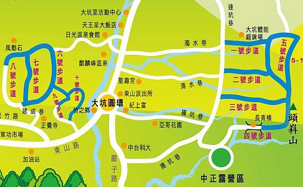 大坑風景區內共有12條步道,其中1~5號及5-1號共6條步道與頭嵙山相接,