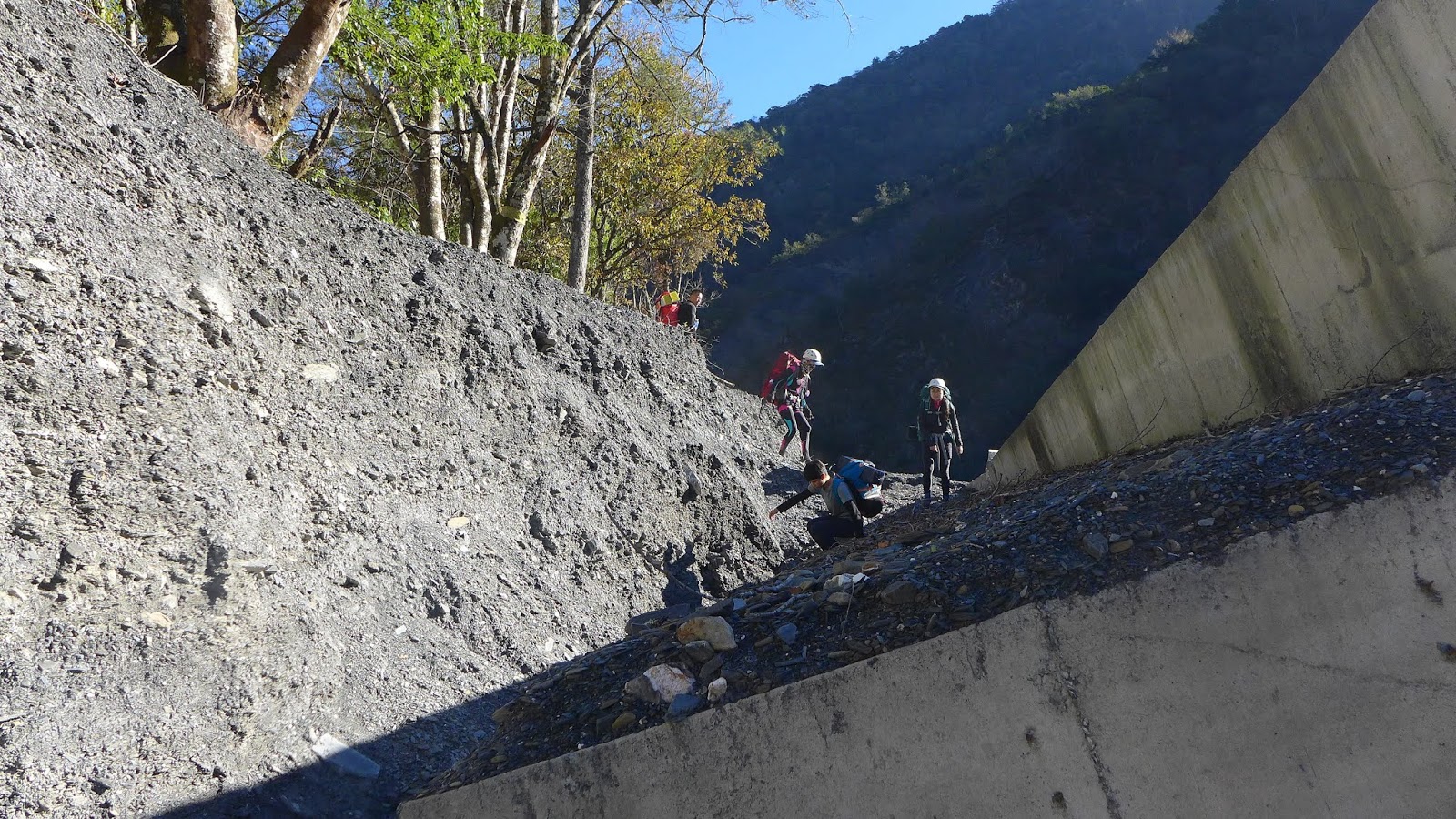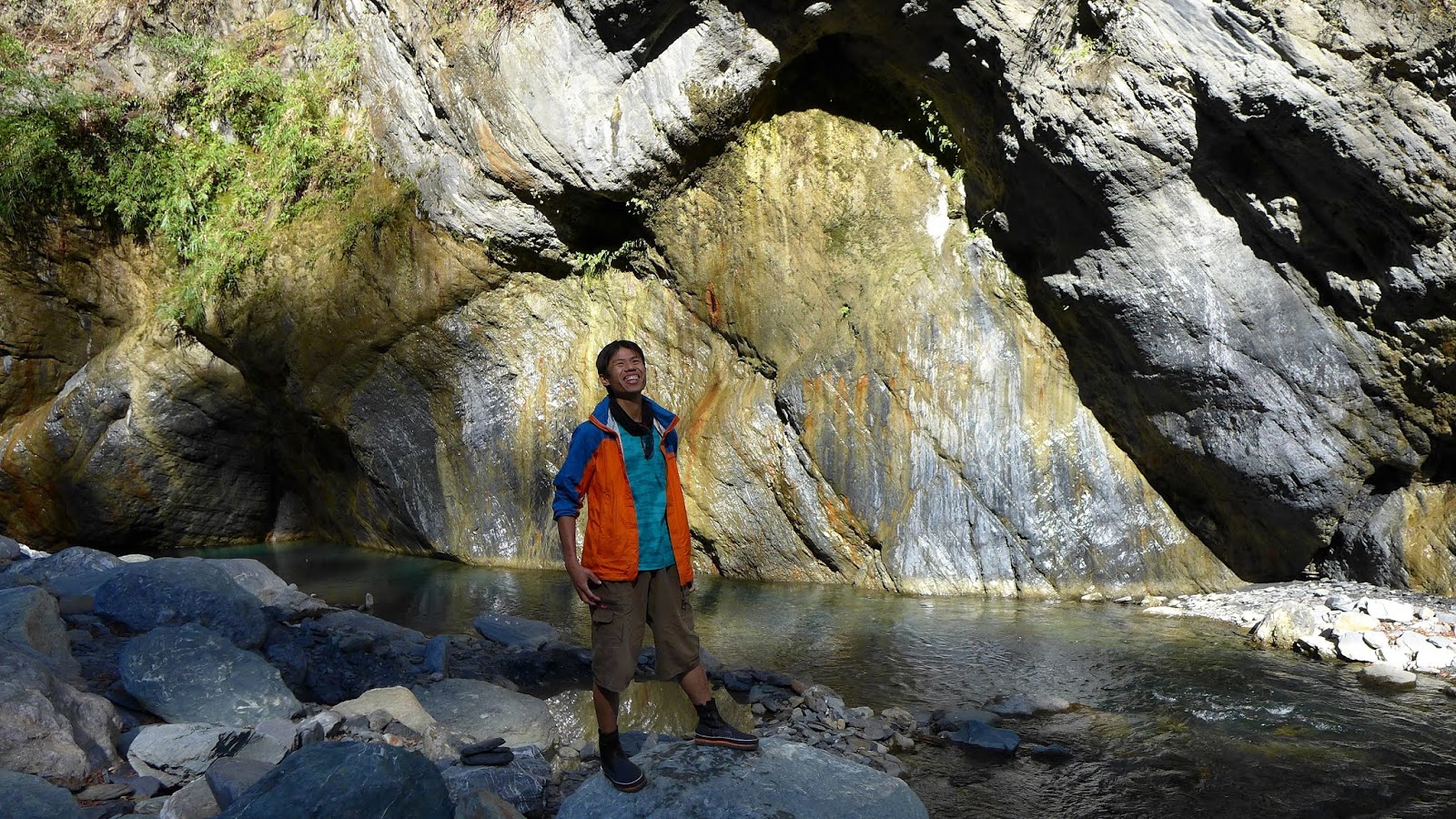 不需開頭燈的時間估算還有1小時多的時間,看樣子應該能不摸黑抵達營地,續行河床大約20分鐘,開始看到岩壁有些不同的顏色,應該快到主要的溫泉露頭處了。