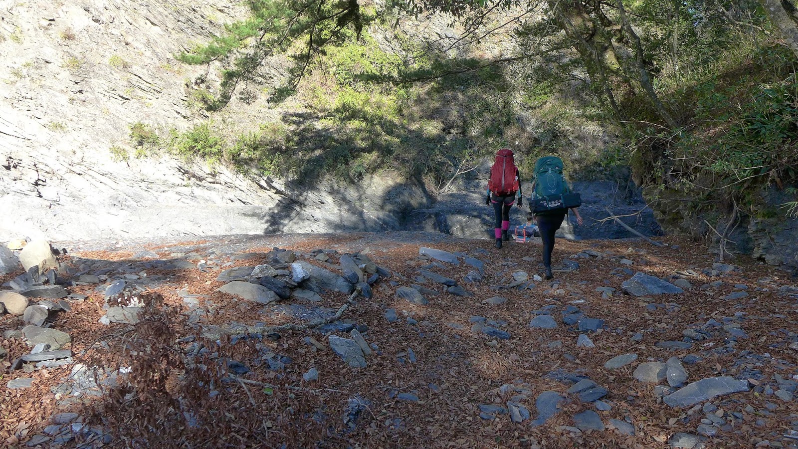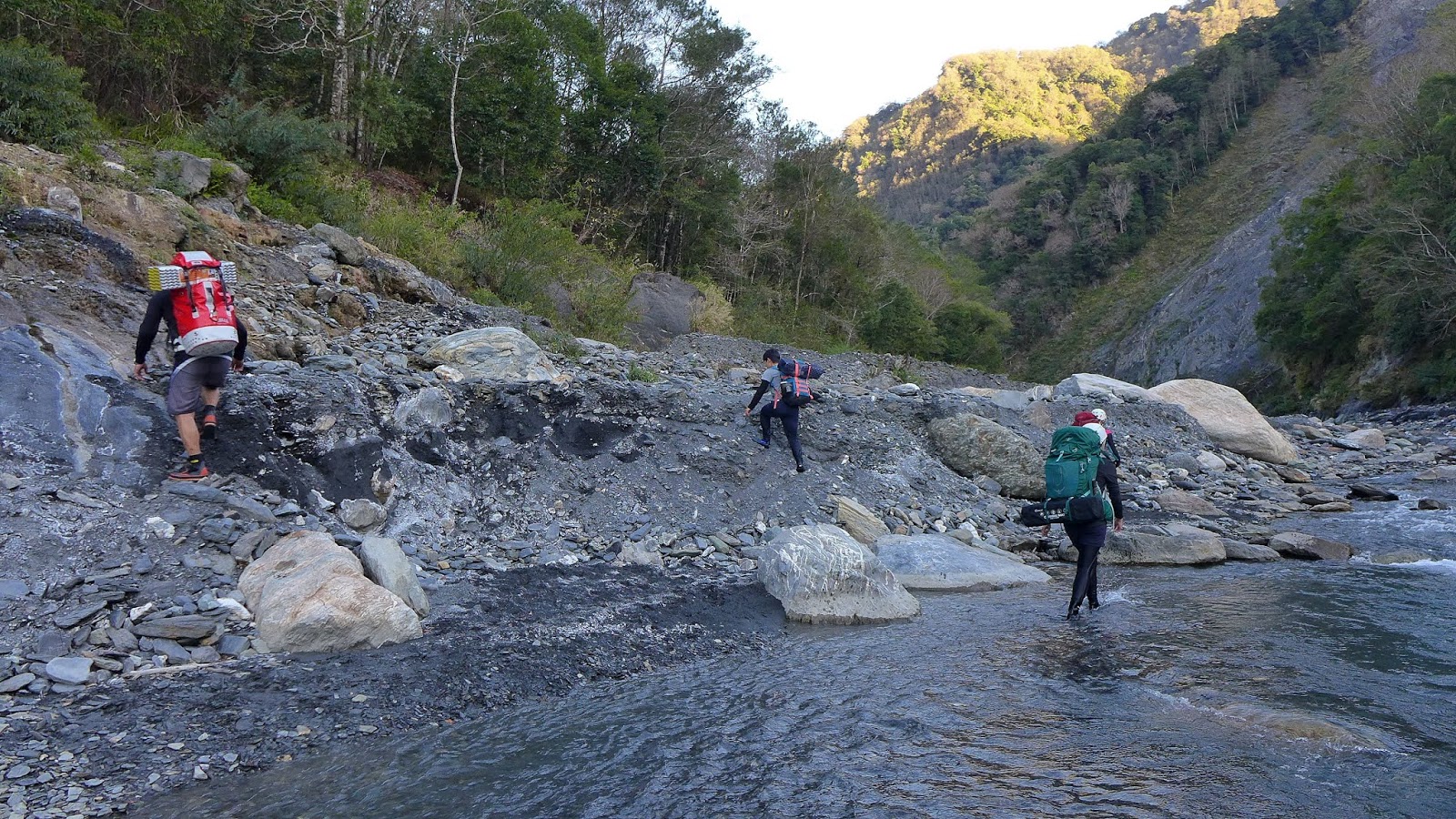 抵舊宿舍稍休息會,找下切點,落差頗大,原本下溪的路已經沖毀了,最後從宿舍旁破損的河提下切,下到河床的位置是萬大南、北溪匯流後的萬大溪,水流有點強,過溪要注意,接下來的過程就沒什麼太困難的過溪。