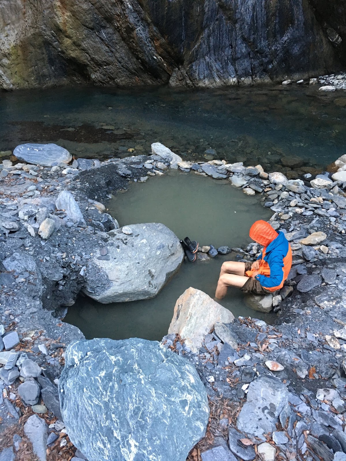 離開峽谷區就發現了一池,在昨天經過的營地附近,原來我們紮營點就已經是第二池了,只是昨天我們走較高的岸地所以沒看到,第一池溫度比第二池再高一些,也還能再挖深一點,泉池也較清澈。