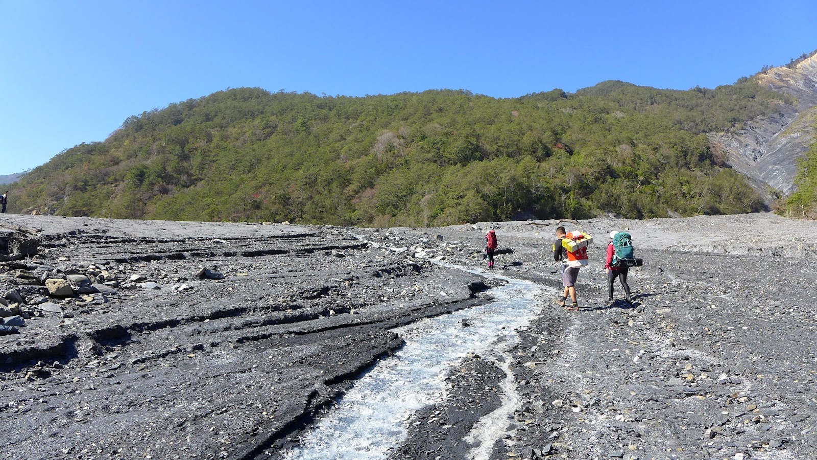在平原上經過第一道支流非常特別,不知什麼原因,水呈現牛奶色,實際看起來是水流下方的石頭呈現乳白色的關係,由馬海濮山流向萬大北溪,走到這離溫泉也不遠了,從出發開始算,到這是3點50分,花近約2小時,但沿途我們有多次停留休息,加上在這大沙洲平原拍照也拍了一段時間,也就是實際上若是認真走的話,應該1小時初就到這了,比預期的快很多。
