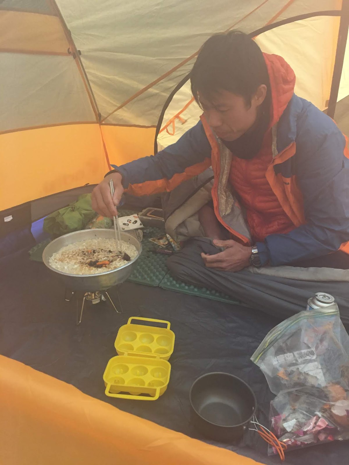 晚上河谷風挺大的,捨不得脫外套,大家都只有泡泡腳聊天,這一池溫度還不錯,都不用調,不過晚上在睡的時候覺得風一直吹進帳內,實在有點被冷到沒睡好,隔天大家躲在帳內七拖八賴,直到有點陽光照射進來才有出帳蓬的意願,原訂規劃一早拔營,再去馬海濮溫泉玩,只不過當下覺得在此耍廢也不賴。