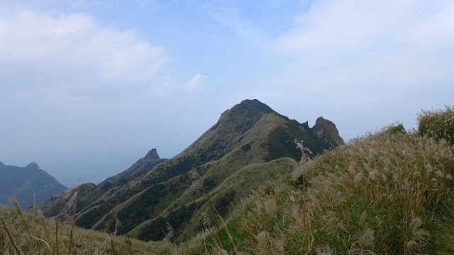 茶壺山經半屏山到草山戰備道這一段為黃金三稜,除交通方便外,步道完整,遊客較多,路徑上的芒草不會像其他路線很快的就被淹沒,其難度要說為所有黃金稜線中最簡單的一條並不為過,景色不打折扣,全程皆有展望,最適合大眾化的路線,這一條,此次前來除了正規路線外,順道加攀上獨立岩體看看不同角度的風景。